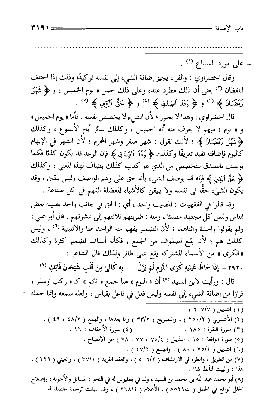 قال الخضراوي: وهذا لا يجوز؛ لأن الشيء لا يخصص نفسه. فأما «يوم الخميس» و «يوم» مبهم لا يعرف منه أنه الخميس، وكذلك سائر أيام الأسبوع، وكذلك شَهْرُ رَمَضانَ؛ لأنك تقول: شهر صفر وشهر المحرم؛ لأن الشهر في الإبهام كاليوم فإضافته تفيد تعريفا وكذلك وَعْدَ الصِّدْقِ فإن الوعد قد يكون كذبا فكما يوصف بالصدق ليتخصص من الذي هو كذب كذلك يضاف لهذا المعنى، وكذلك حَقُّ الْيَقِينِ فإنه قد يوصف الشيء بأنه حق على وهم الواصف وليس بيقين، وقد يكون الشيء حقّا في نفسه ولا يتيقن كالأشياء المعضلة الفهم في كل صناعة.