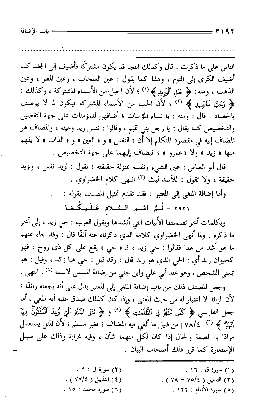 وَحَبَّ الْحَصِيدِ (¬2)؛ لأن الحب من الأسماء المشتركة فيكون لما لا يوصف بالحصاد. قال: ومنه: يا نساء المؤمنات؛ أضافهن للمؤمنات على جهة التفضيل والتخصيص كما يقال: يا رجل بني تميم، وقالوا: نفس زيد وعينه، والمضاف هو المضاف إليه في مقصود المتكلم إلا أن «النفس» و «العين» و «الذات» لا يفهم منها «زيد» ولا «عمرو»؛ فيضاف إليهما على جهة التخصيص.