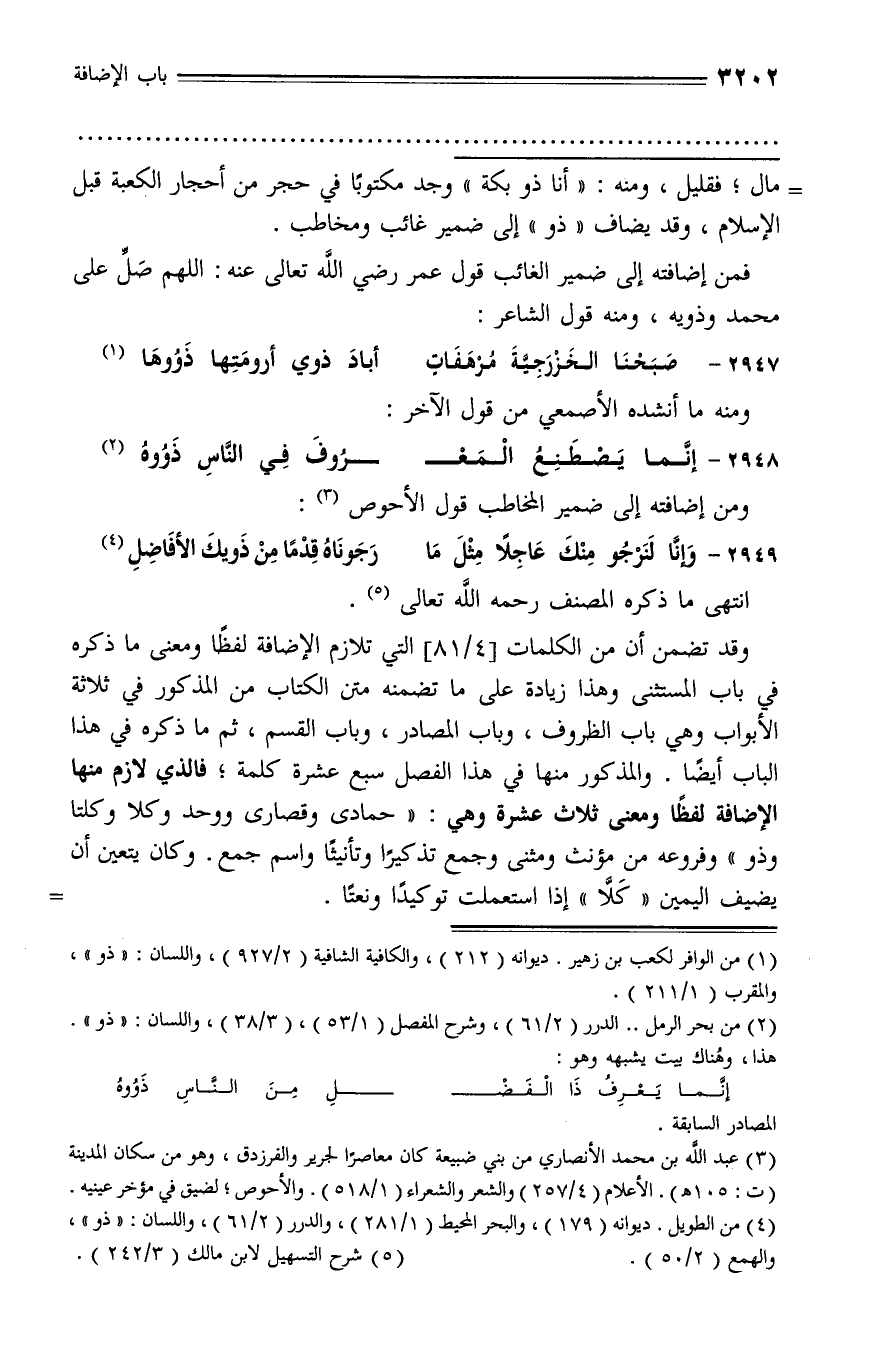 في هذا الباب أيضا. والمذكور منها في هذا الفصل سبع عشرة كلمة؛ فالذي لازم منها الإضافة لفظا ومعنى ثلاث عشرة وهي: «حمادى وقصارى ووحد وكلا وكلتا وذو» وفروعه من مؤنث ومثنى وجمع تذكيرا وتأنيثا واسم جمع. وكان يتعين أن يضيف اليمين «كلّا» إذا استعملت توكيدا ونعتا. -