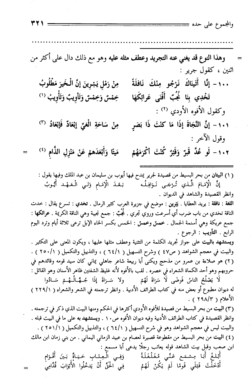 وهذا النوع قد يغني عنه التجريد وعطف مثله عليه وهو مع ذلك دال على أكثر من اثنين، كقول جرير: