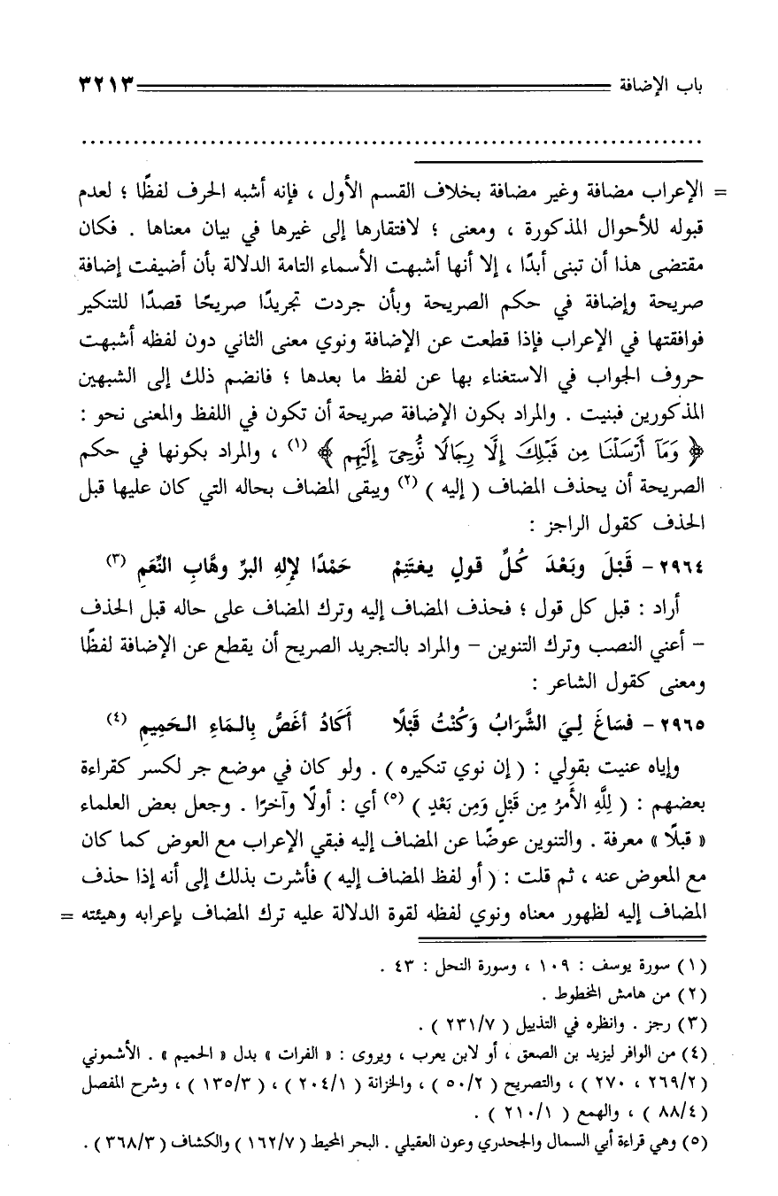 وَما أَرْسَلْنا مِنْ قَبْلِكَ إِلَّا رِجالًا نُوحِي إِلَيْهِمْ * (¬1)، والمراد بكونها في حكم الصريحة أن يحذف المضاف (إليه) (¬2) ويبقى المضاف بحاله التي كان عليها قبل الحذف كقول الراجز: