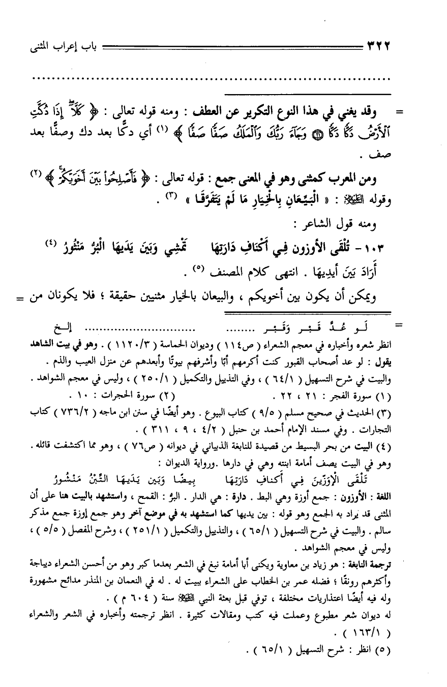 ومن المعرب كمثنى وهو في المعنى جمع: قوله تعالى: فَأَصْلِحُوا بَيْنَ أَخَوَيْكُمْ (¬2) وقوله عليه السّلام: «البيّعان بالخيار ما لم يتفرّقا» (¬3).