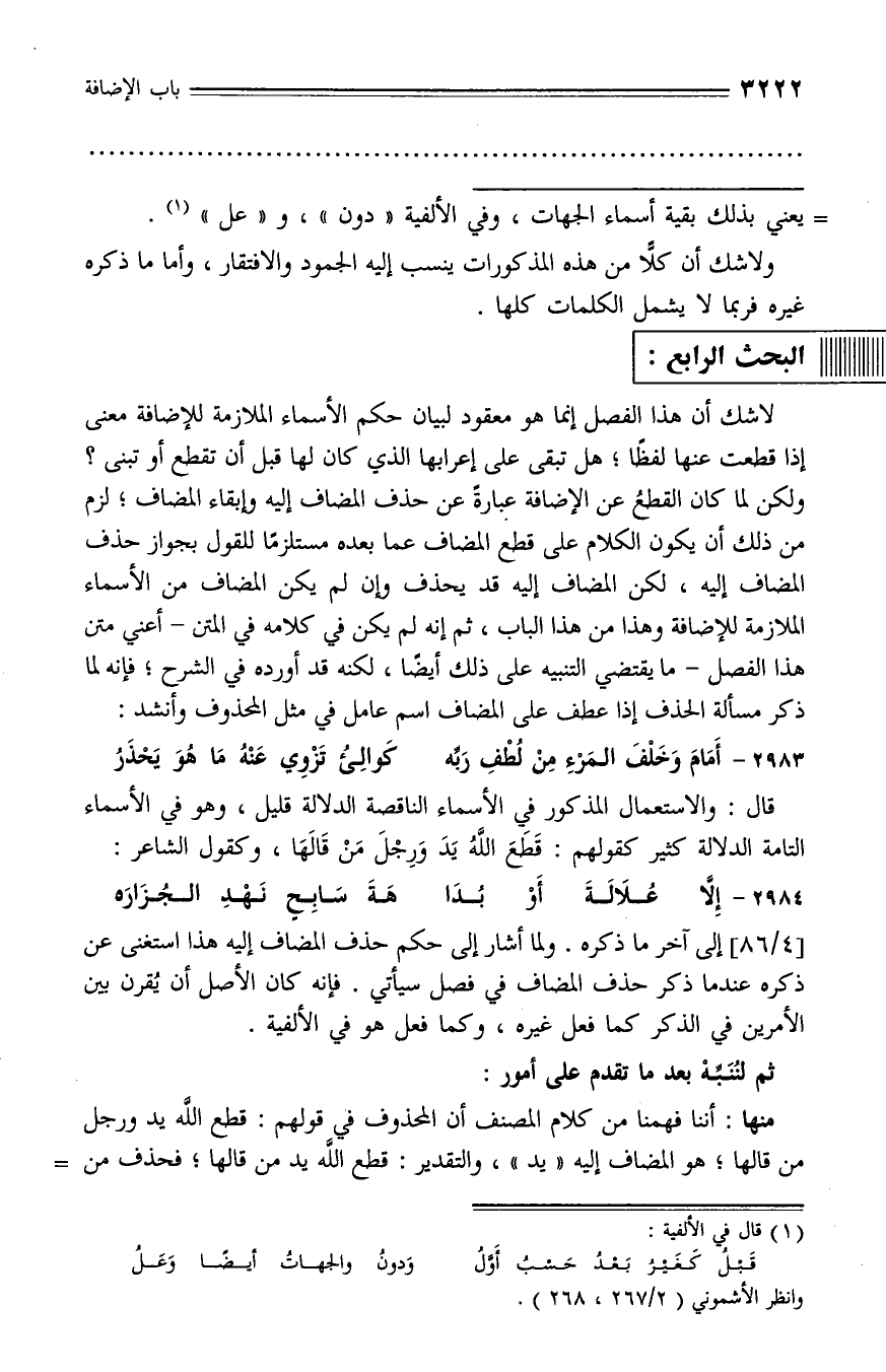 [4/ 86] إلى آخر ما ذكره. ولما أشار إلى حكم حذف المضاف إليه هذا استغنى عن ذكره عند ما ذكر حذف المضاف في فصل سيأتي. فإنه كان الأصل أن يقرن بين الأمرين في الذكر كما فعل غيره، وكما فعل هو في الألفية.