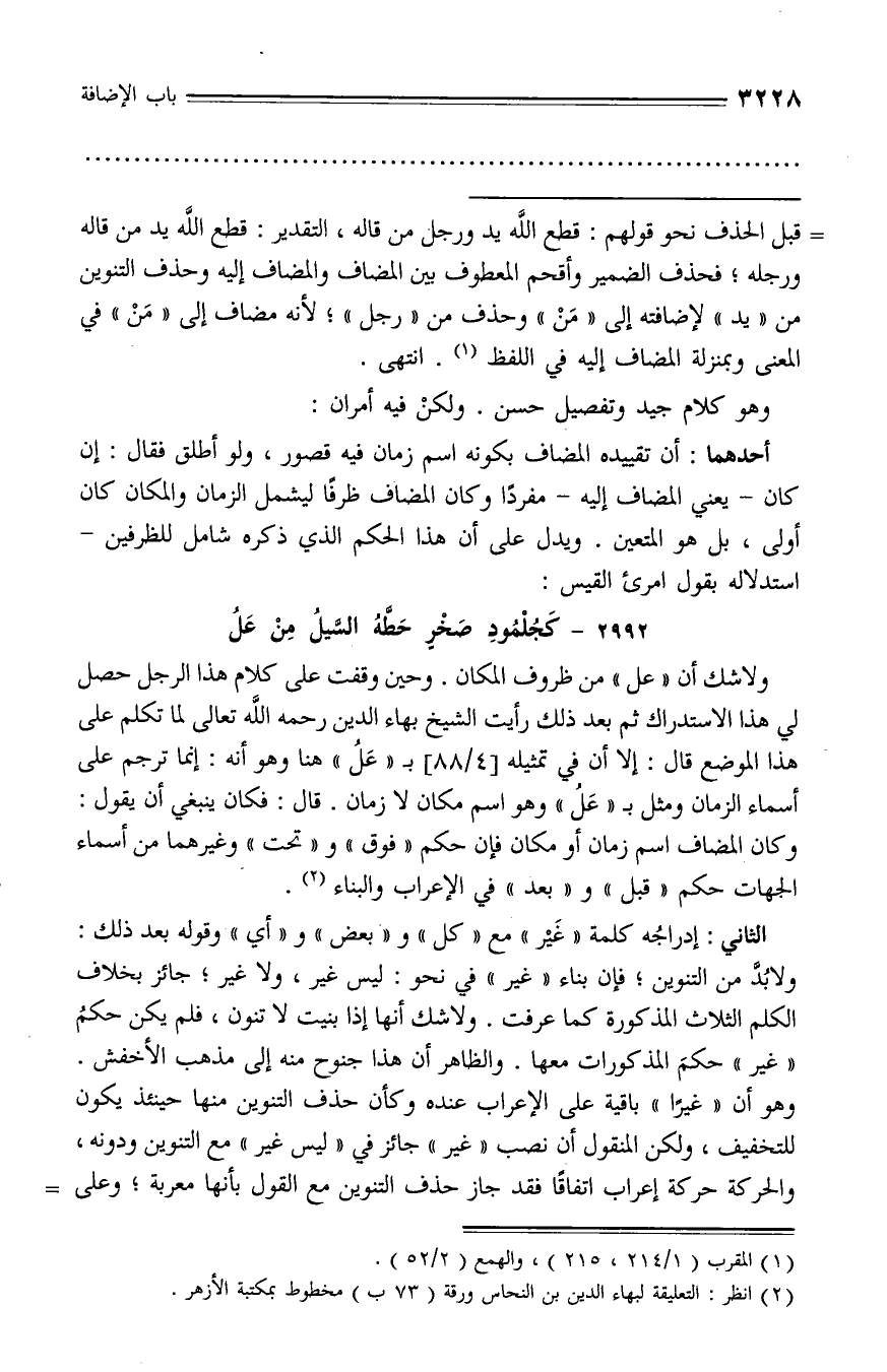 أحدهما: أن تقييده المضاف بكونه اسم زمان فيه قصور، ولو أطلق فقال: إن كان - يعني المضاف إليه - مفردا وكان المضاف ظرفا ليشمل الزمان والمكان كان أولى، بل هو المتعين. ويدل على أن هذا الحكم الذي ذكره شامل للظرفين - استدلاله بقول امرئ القيس: