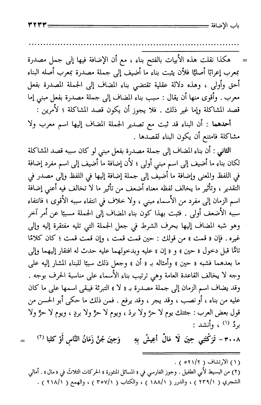 هكذا نقلت هذه الأبيات بالفتح بناء، مع أن الإضافة فيها إلى جمل مصدرة بمعرب إعرابا أصليّا فلأن يثبت بناء ما أضيف إلى جملة مصدرة بمعرب أصله البناء أحق وأولى، وهذه دلالة عقلية تقتضي بناء المضاف إلى الجملة المصدرة بفعل معرب. وأقوى منها أن يقال: سبب بناء المضاف إلى جملة مصدرة بفعل مبني إما قصد المشاكلة وإما غير ذلك. فلا يجوز أن يكون قصد المشاكلة؛ لأمرين: