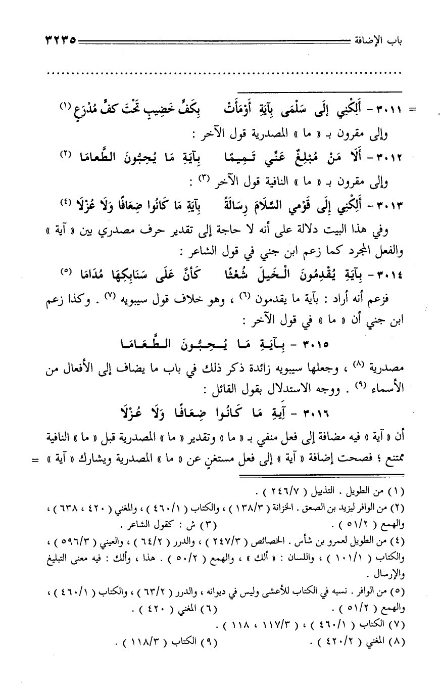 وفي هذا البيت دلالة على أنه لا حاجة إلى تقدير حرف مصدري بين «آية» والفعل المجرد كما زعم ابن جني في