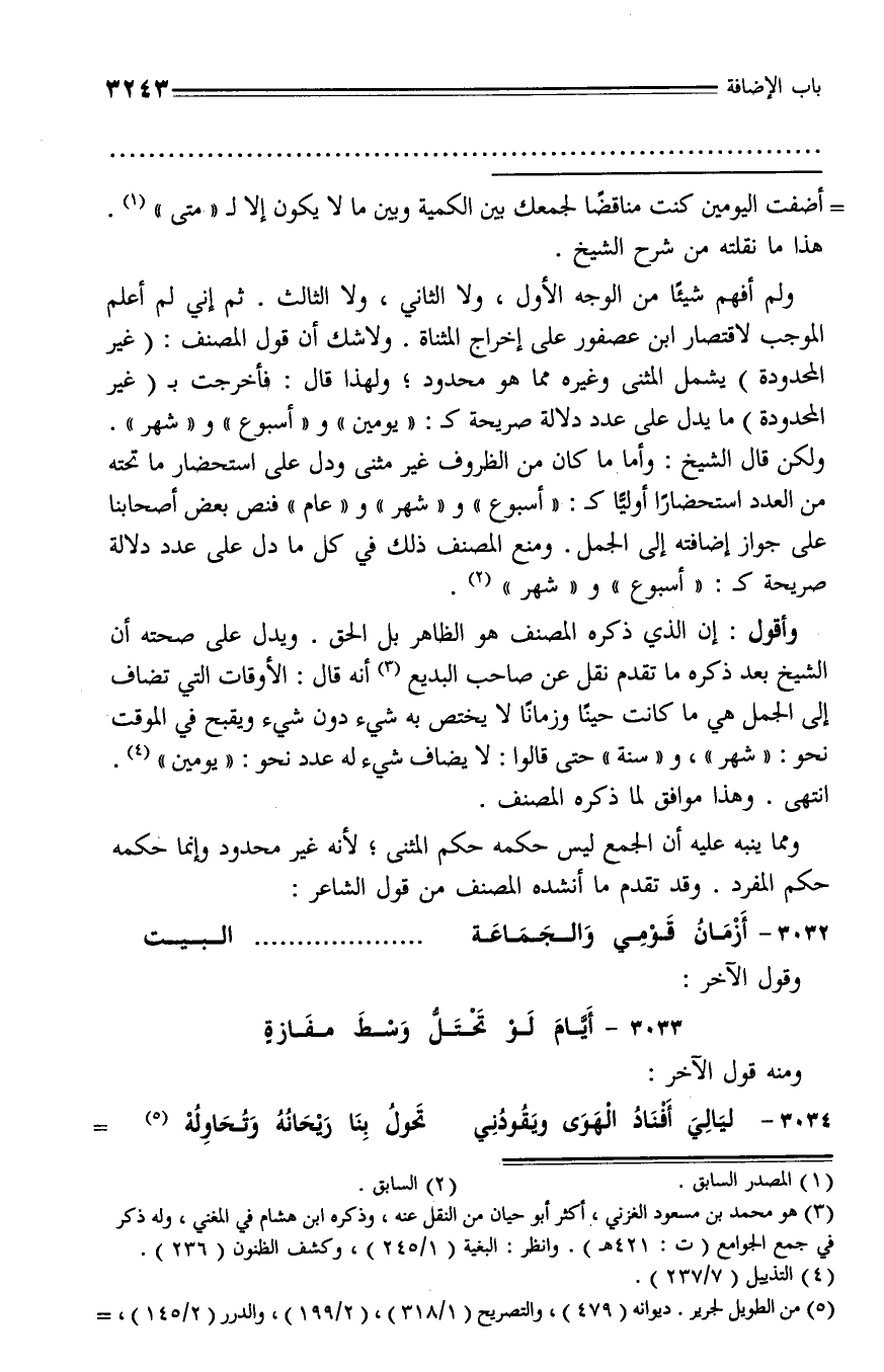 ولم أفهم شيئا من الوجه الأول، ولا الثاني، ولا الثالث. ثم إني لم أعلم الموجب لاقتصار ابن عصفور على إخراج المثناة. ولا شك أن قول المصنف: (غير المحدودة) يشمل المثنى وغيره مما هو محدود؛ ولهذا قال: فأخرجت بـ (غير المحدودة) ما يدل على عدد دلالة صريحة كـ: «يومين» و «أسبوع» و «شهر».