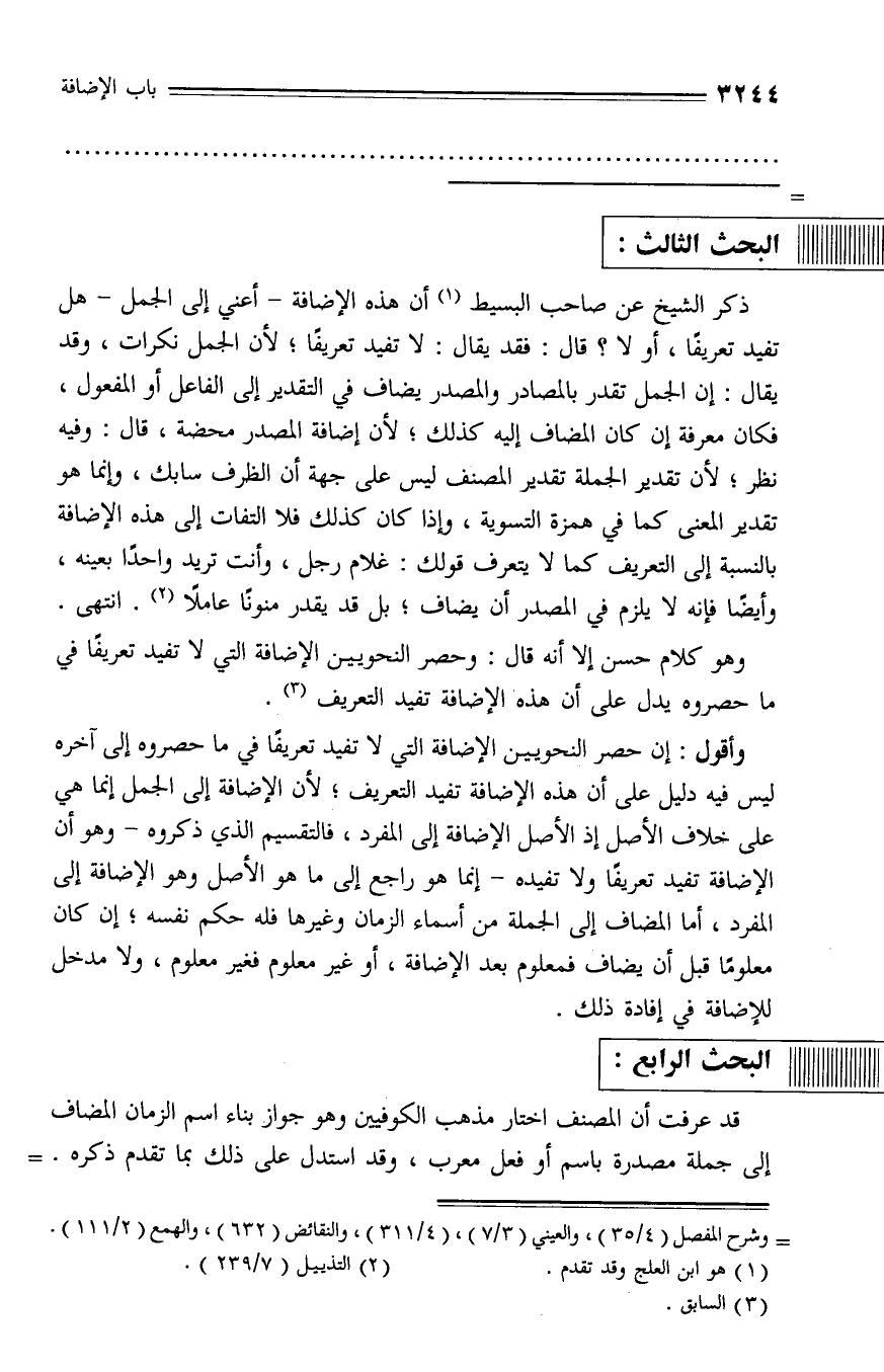 وأقول: إن حصر النحويين الإضافة التي لا تفيد تعريفا في ما حصروه إلى آخره ليس فيه دليل على أن هذه الإضافة تفيد التعريف؛ لأن الإضافة إلى الجمل إنما هي على خلاف الأصل إذ الأصل الإضافة إلى المفرد، فالتقسيم الذي ذكروه - وهو أن الإضافة تفيد تعريفا ولا تفيده - إنما هو راجع إلى ما هو الأصل وهو الإضافة إلى المفرد، أما المضاف إلى الجملة من أسماء الزمان وغيرها فله حكم نفسه؛ إن كان معلوما قبل أن يضاف فمعلوم بعد الإضافة، أو غير معلوم فغير معلوم، ولا مدخل للإضافة في إفادة ذلك.