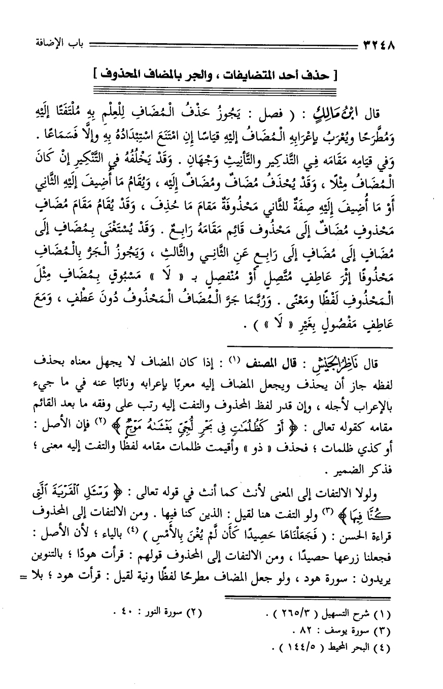 قال ابن مالك: (فصل: يجوز حذف المضاف للعلم به ملتفتا إليه ومطّرحا ويعرب بإعرابه المضاف إليه قياسا إن امتنع استبداده به وإلّا فسماعا.