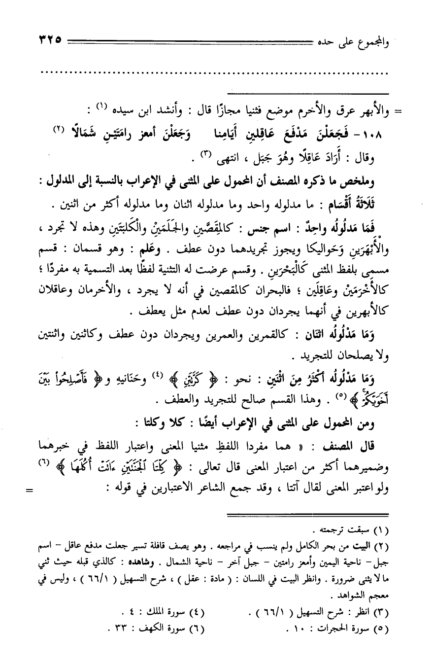 وما مدلوله أكثر من اثنين: نحو: كَرَّتَيْنِ (¬4) وحنانيه وفَأَصْلِحُوا بَيْنَ أَخَوَيْكُمْ (¬5). وهذا القسم صالح للتجريد والعطف.