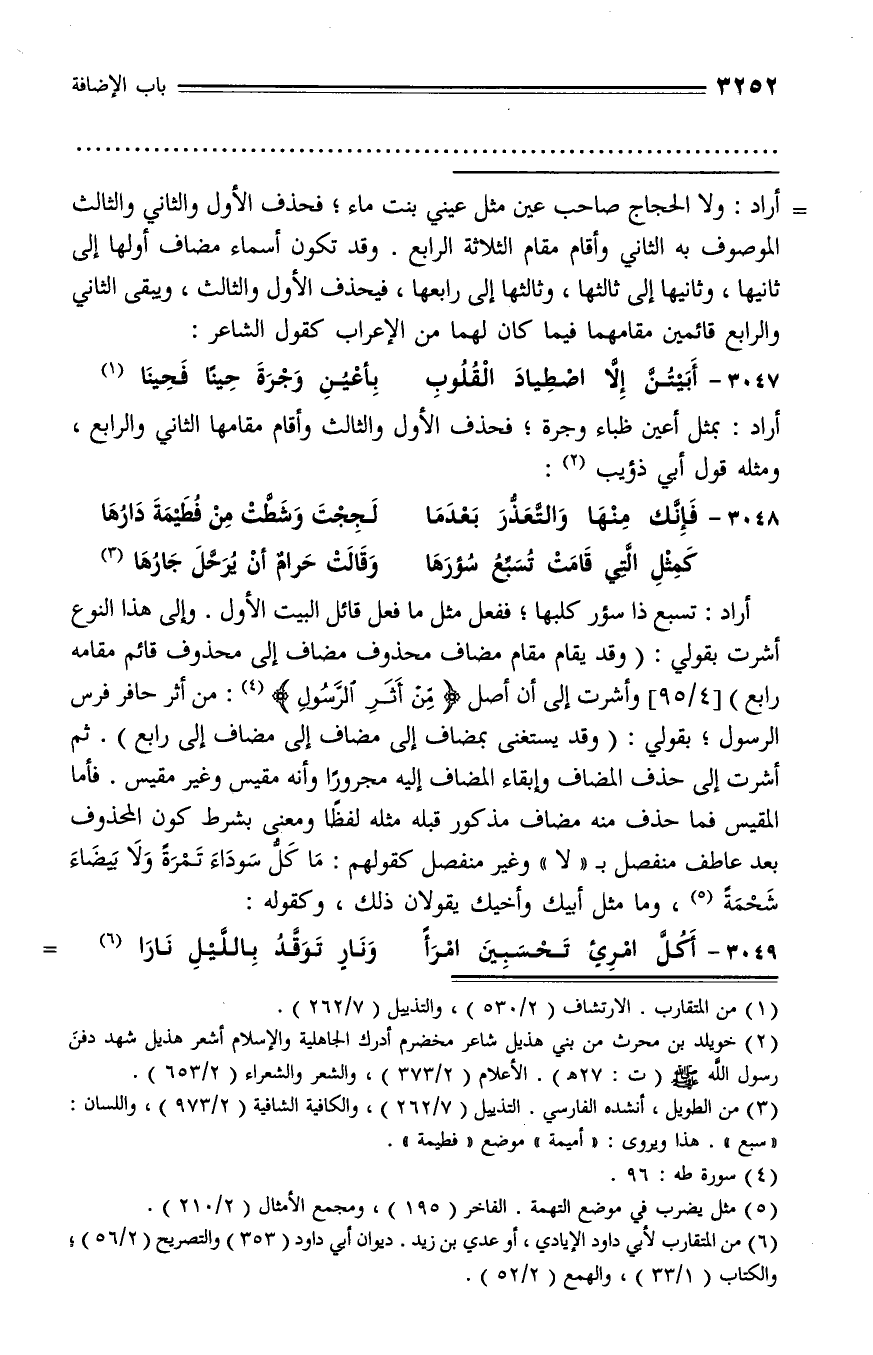 أراد: تسبع ذا سؤر كلبها؛ ففعل مثل ما فعل قائل البيت الأول. وإلى هذا النوع أشرت بقولي: (وقد يقام مقام مضاف محذوف مضاف إلى محذوف قائم مقامه رابع) [4/ 95] وأشرت إلى أن أصل مِنْ أَثَرِ الرَّسُولِ (¬4): من أثر حافر فرس الرسول؛ بقولي: (وقد يستغنى بمضاف إلى مضاف إلى مضاف إلى رابع). ثم أشرت إلى حذف المضاف وإبقاء المضاف إليه مجرورا وأنه مقيس وغير مقيس. فأما المقيس فما حذف منه مضاف مذكور قبله مثله لفظا ومعنى بشرط كون المحذوف بعد عاطف منفصل بـ «لا» وغير منفصل كقولهم: ما كلّ سوداء تمرة ولا بيضاء شحمة (¬5)، وما مثل أبيك وأخيك يقولان ذلك، وكقوله: