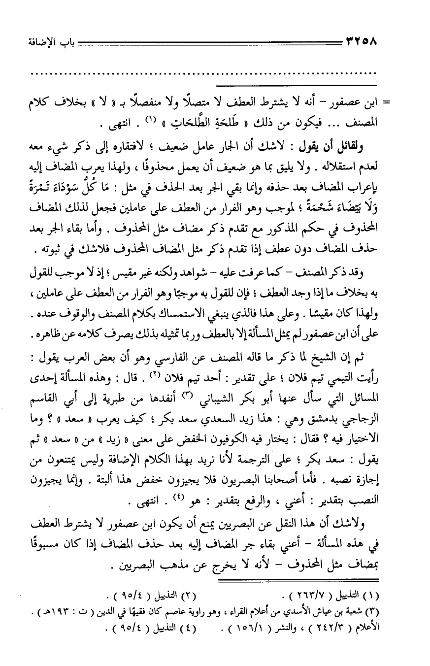 ولا شك أن هذا النقل عن البصريين يمنع أن يكون ابن عصفور لا يشترط العطف في هذه المسألة - أعني بقاء جر المضاف إليه بعد حذف المضاف إذا كان مسبوقا بمضاف مثل المحذوف - لأنه لا يخرج عن مذهب البصريين.