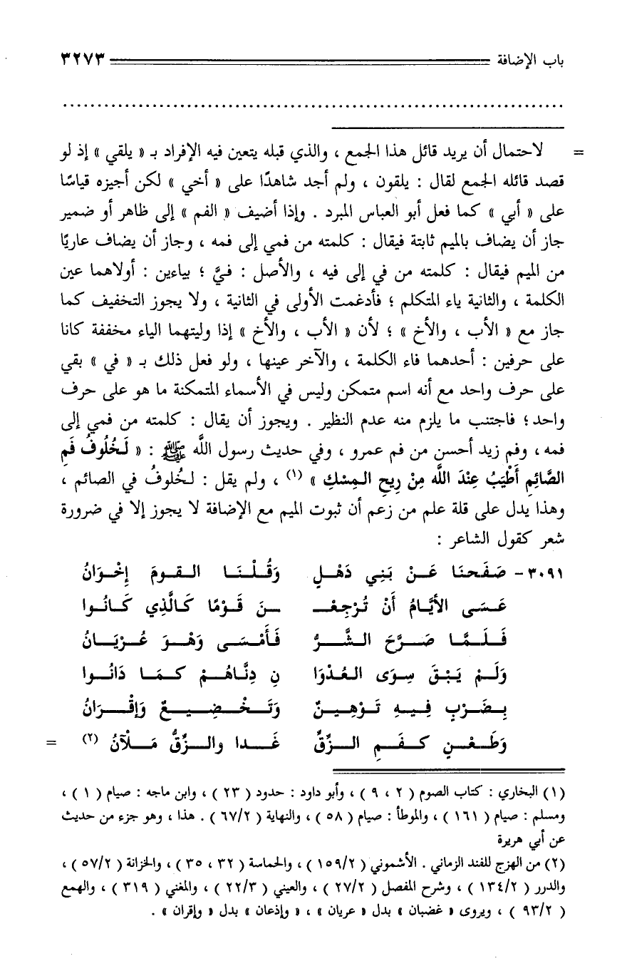 أجد شاهدا على «أخي» لكن أجيزه قياسا على «أبي» كما فعل أبو العباس المبرد. وإذا أضيف «الفم» إلى ظاهر أو ضمير جاز أن يضاف بالميم ثابتة فيقال: كلمته من فمي إلى فمه، وجاز أن يضاف عاريا من الميم فيقال: كلمته من في إلى فيه، والأصل: فيّ؛ بياءين: أولاهما عين الكلمة، والثانية ياء المتكلم؛ فأدغمت الأولى في الثانية، ولا يجوز التخفيف كما جاز مع «الأب، والأخ»؛ لأن «الأب، والأخ» إذا وليتهما الياء مخففة كانا على حرفين: أحدهما فاء الكلمة، والآخر عينها، ولو فعل ذلك بـ «في» بقي على حرف واحد مع أنه اسم متمكن وليس في الأسماء المتمكنة ما هو على حرف واحد؛ فاجتنب ما يلزم منه عدم النظير. ويجوز أن يقال: كلمته من فمي إلى فمه، وفم زيد أحسن من فم عمرو، وفي حديث رسول الله صلّى الله عليه وسلّم: «لخلوف فم الصّائم أطيب عند الله من ريح المسك» (¬1)، ولم يقل: لخلوف في الصائم، وهذا يدل على قلة علم من زعم أن ثبوت الميم مع الإضافة لا يجوز إلا في ضرورة شعر كقول الشاعر: