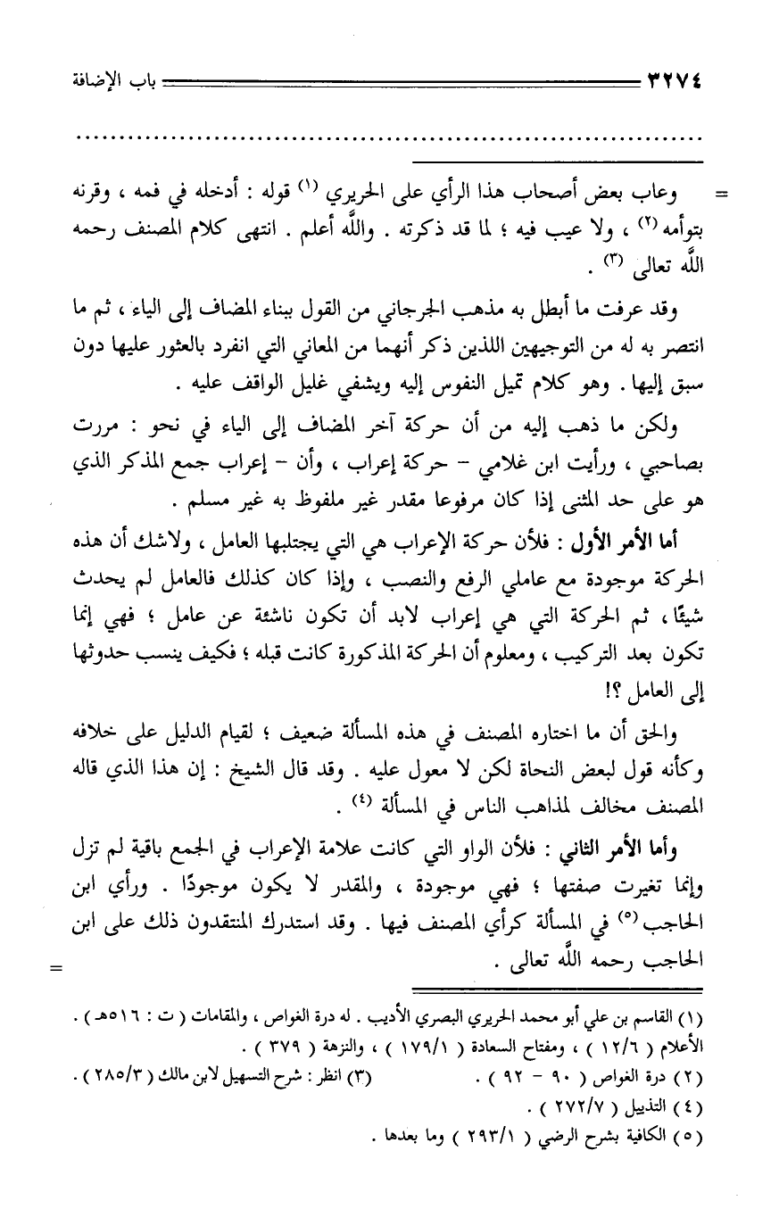 ولكن ما ذهب إليه من أن حركة آخر المضاف إلى الياء في نحو: مررت بصاحبي، ورأيت ابن غلامي - حركة إعراب، وأن - إعراب جمع المذكر الذي هو على حد المثنى إذا كان مرفوعا مقدر غير ملفوظ به غير مسلم.