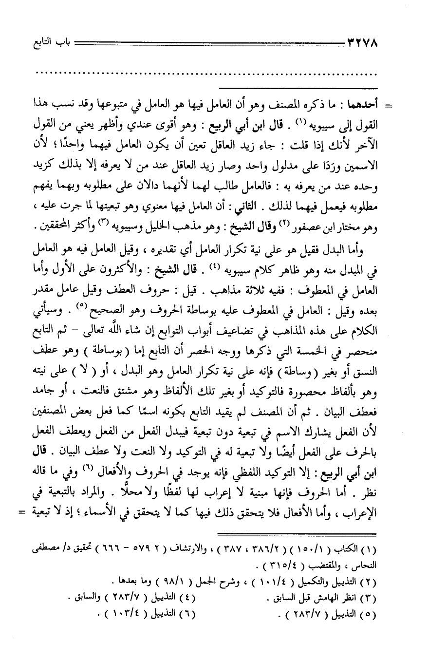 وأما البدل فقيل هو على نية تكرار العامل أي تقديره، وقيل العامل فيه هو العامل في المبدل منه وهو ظاهر كلام سيبويه (¬4). قال الشيخ: والأكثرون على الأول وأما العامل في المعطوف: ففيه ثلاثة مذاهب. قيل: حروف العطف وقيل عامل مقدر بعده وقيل: العامل في المعطوف عليه بوساطة الحروف وهو الصحيح (¬5). وسيأتي الكلام على هذه المذاهب في تضاعيف أبواب التوابع إن شاء الله تعالى - ثم التابع منحصر في الخمسة التي ذكرها ووجه الحصر أن التابع إما (بوساطة) وهو عطف النسق أو بغير (وساطة) فإنه على نية تكرار العامل وهو البدل، أو (لا)