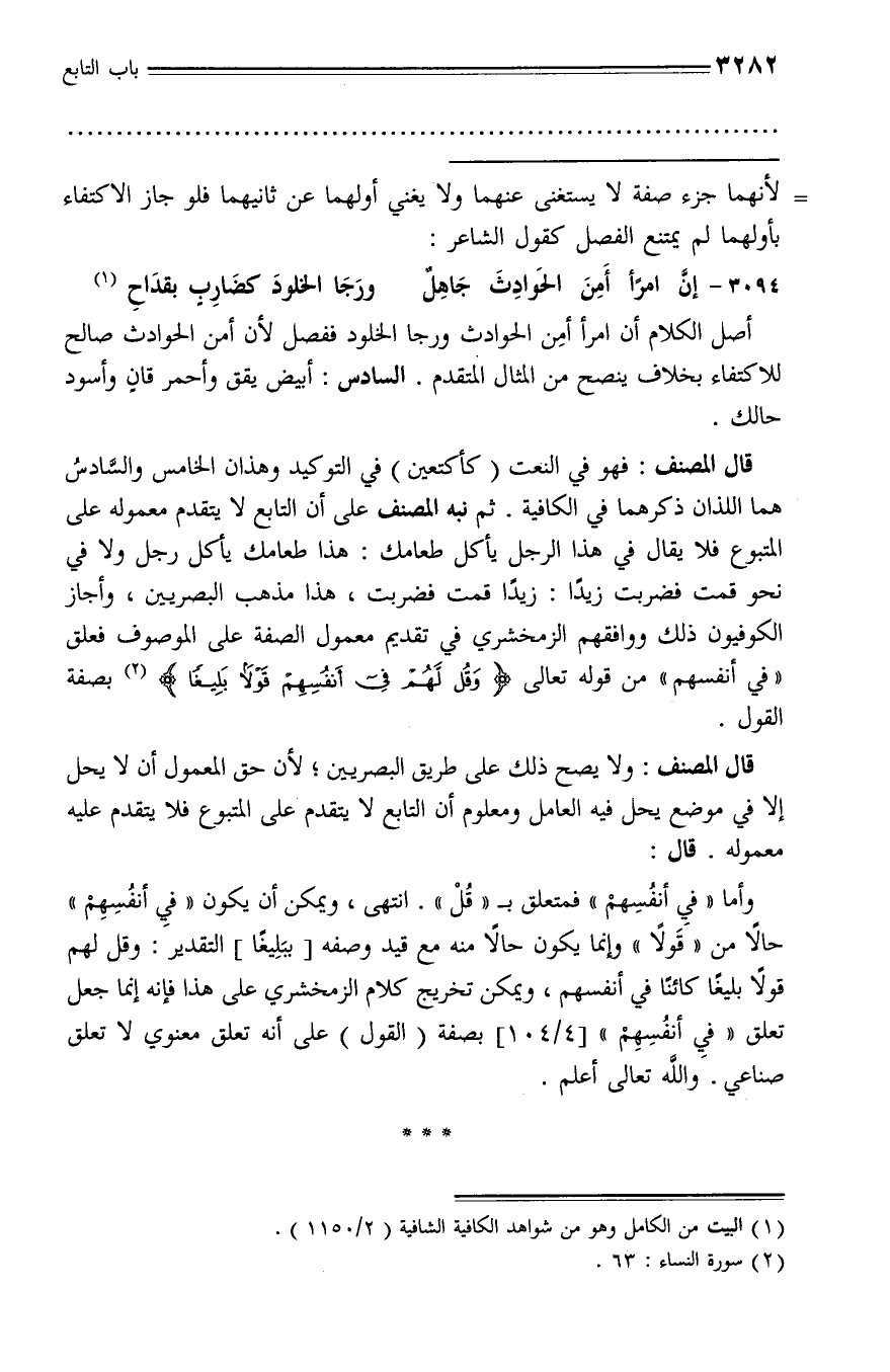 قال المصنف: فهو في النعت (كأكتعين) في التوكيد وهذان الخامس والسّادس هما اللذان ذكرهما في الكافية. ثم نبه المصنف على أن التابع لا يتقدم معموله على المتبوع فلا يقال في هذا الرجل يأكل طعامك: هذا طعامك يأكل رجل ولا في نحو قمت فضربت زيدا: زيدا قمت فضربت، هذا مذهب البصريين، وأجاز الكوفيون ذلك ووافقهم الزمخشري في تقديم معمول الصفة على الموصوف فعلق «في أنفسهم» من قوله تعالى وَقُلْ لَهُمْ فِي أَنْفُسِهِمْ قَوْلًا بَلِيغاً (¬2) بصفة القول.