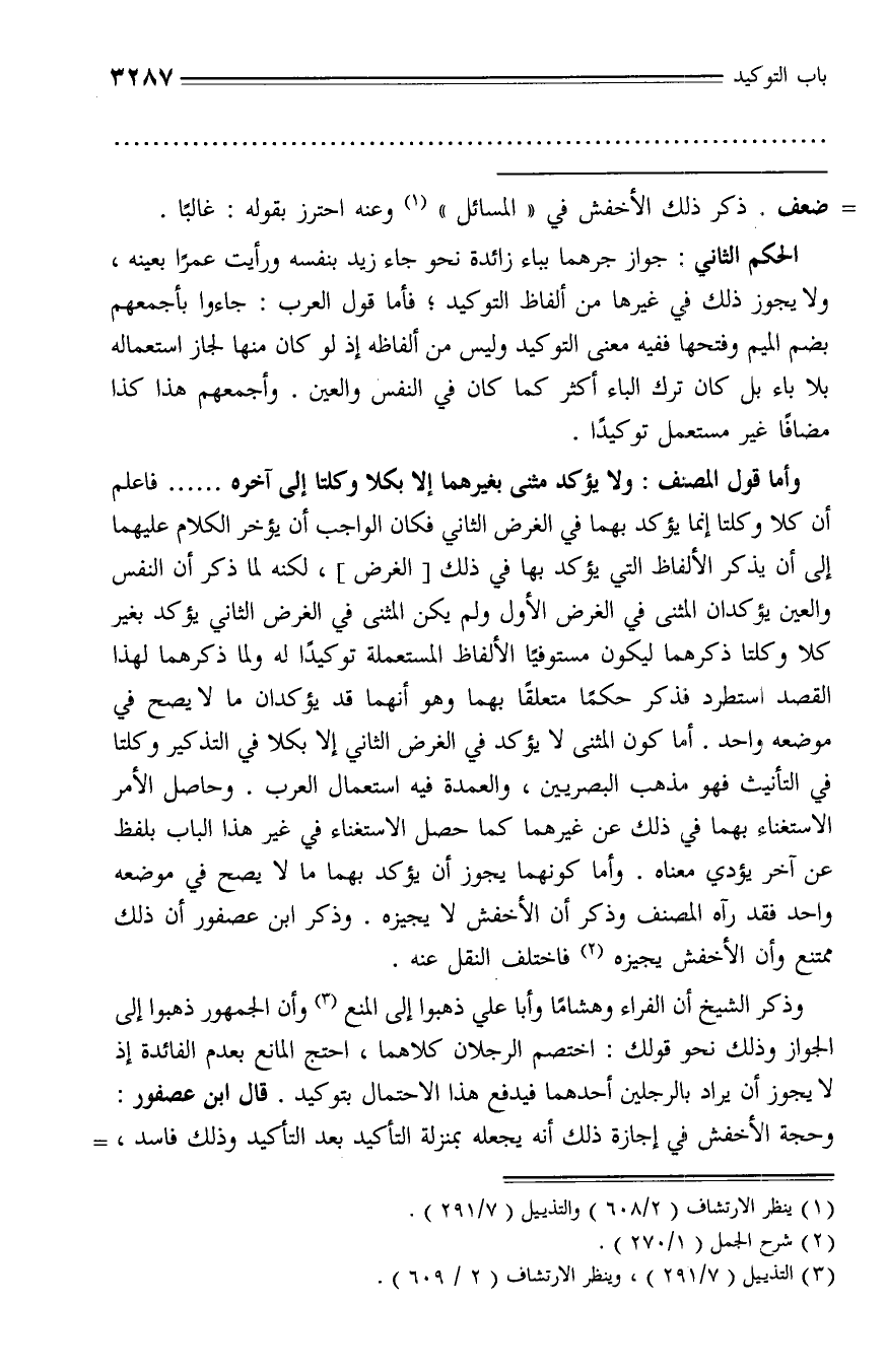 وأما قول المصنف: ولا يؤكد مثنى بغيرهما إلا بكلا وكلتا إلى آخره ..... فاعلم أن كلا وكلتا إنما يؤكد بهما في الغرض الثاني فكان الواجب أن يؤخر الكلام عليهما إلى أن يذكر الألفاظ التي يؤكد بها في ذلك [الغرض]، لكنه لما ذكر أن النفس والعين يؤكدان المثنى في الغرض الأول ولم يكن المثنى في الغرض الثاني يؤكد بغير كلا وكلتا ذكرهما ليكون مستوفيا الألفاظ المستعملة توكيدا له ولما ذكرهما لهذا القصد استطرد فذكر حكما متعلقا بهما وهو أنهما قد يؤكدان ما لا يصح في موضعه واحد. أما كون المثنى لا يؤكد في الغرض الثاني إلا بكلا في التذكير وكلتا في التأنيث فهو مذهب البصريين، والعمدة فيه استعمال العرب. وحاصل الأمر الاستغناء بهما في ذلك عن غيرهما كما حصل الاستغناء في غير هذا الباب بلفظ عن آخر يؤدي معناه. وأما كونهما يجوز أن يؤكد بهما ما لا يصح في موضعه واحد فقد رآه المصنف وذكر أن الأخفش لا يجيزه. وذكر ابن عصفور أن ذلك ممتنع وأن الأخفش يجيزه (¬2) فاختلف النقل عنه.