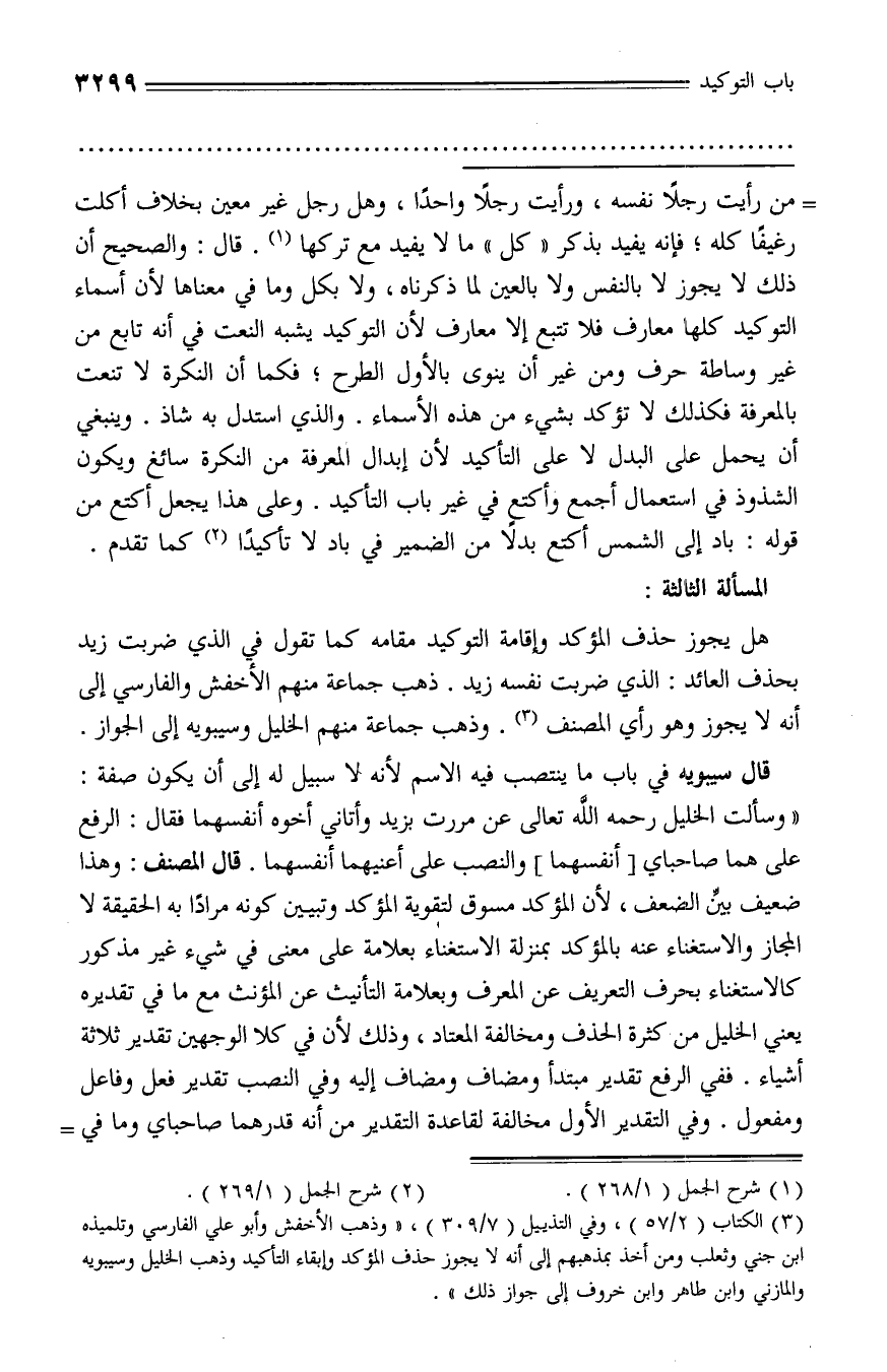 (¬3) الكتاب (2/ 57)، وفي التذييل (7/ 309)، «وذهب الأخفش وأبو علي الفارسي وتلميذه ابن جني وثعلب ومن أخذ بمذهبهم إلى أنه لا يجوز حذف المؤكد وإبقاء التأكيد وذهب الخليل وسيبويه والمازني وابن طاهر وابن خروف إلى جواز ذلك».