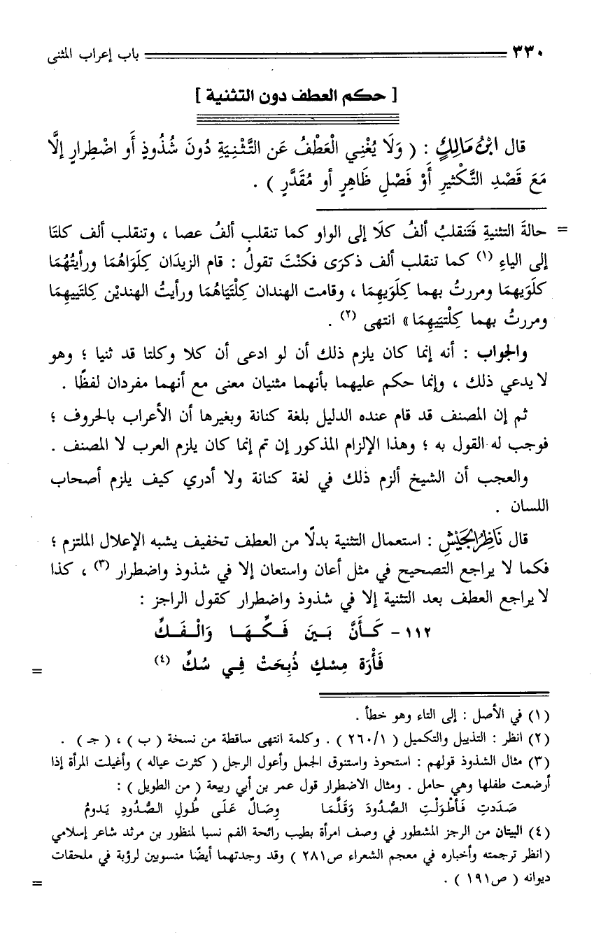 قال ناظر الجيش: استعمال التثنية بدلا من العطف تخفيف يشبه الإعلال الملتزم؛ فكما لا يراجع التصحيح في مثل أعان واستعان إلا في شذوذ واضطرار (¬3)، كذا لا يراجع العطف بعد التثنية إلا في شذوذ واضطرار كقول الراجز: