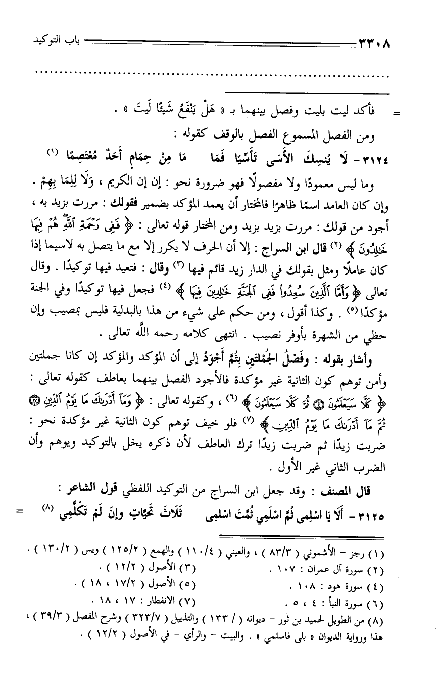 وأشار بقوله: وفصل الجملتين بثمّ أجود إلى أن المؤكد والمؤكد إن كانا جملتين وأمن توهم كون الثانية غير مؤكدة فالأجود الفصل بينهما بعاطف كقوله تعالى: