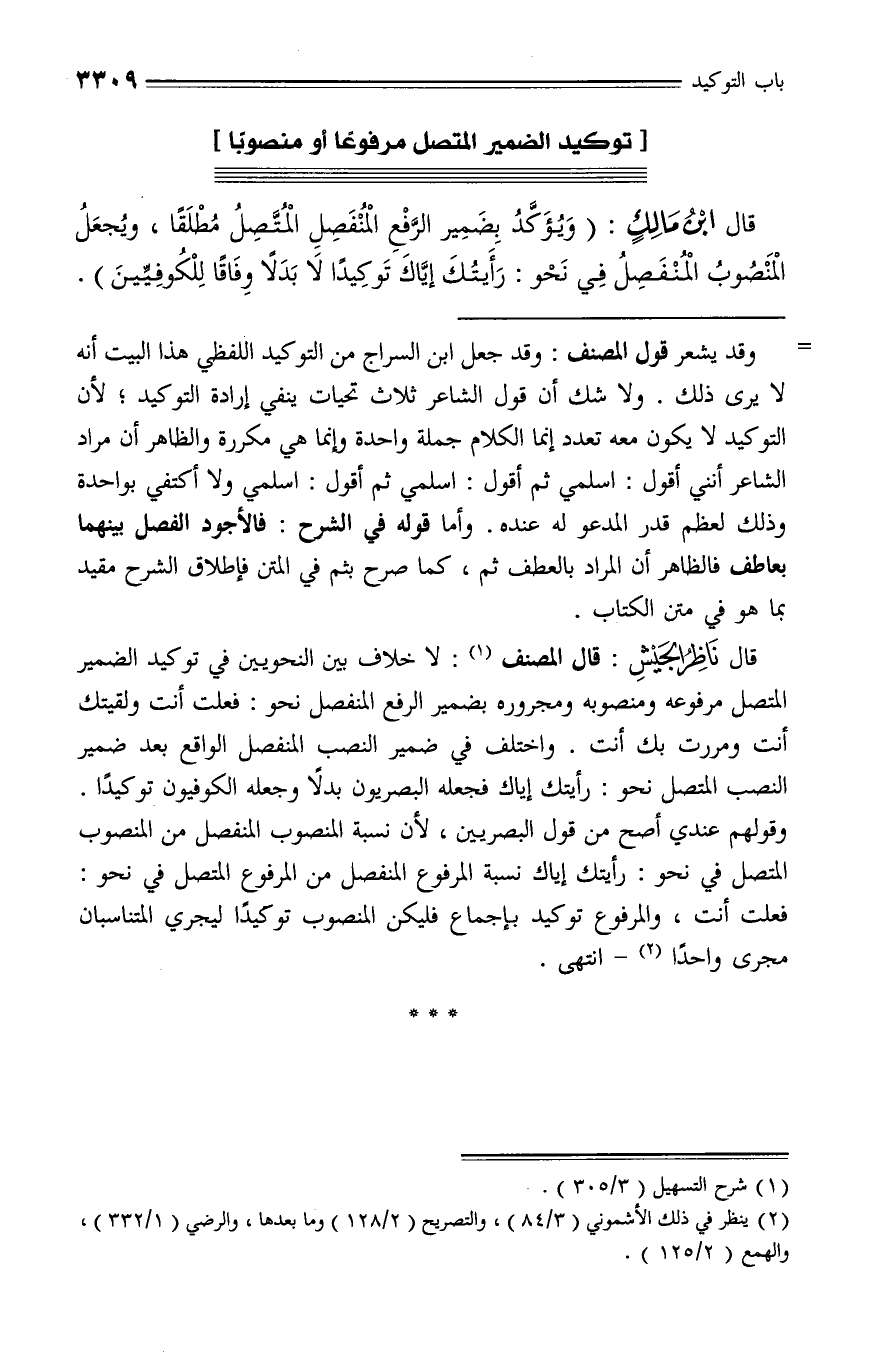 قال ابن مالك: (ويؤكّد بضمير الرّفع المنفصل المتّصل مطلقا، ويجعل المنصوب المنفصل في نحو: رأيتك إيّاك توكيدا لا بدلا وفاقا للكوفيّين).