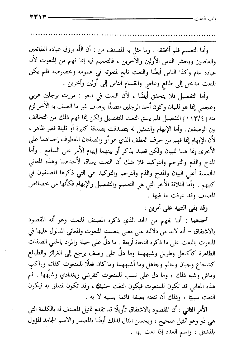 وأما التفصيل فلا يتحقق أيضا، لأن النعت في نحو: مررت برجلين عربي وعجمي إنما هو للبيان وكون أحد الرجلين متصفا بوصف غير ما اتصف به الآخر لزم منه [4/ 113] التفصيل فلم يسق النعت للتفصيل ولكن إنما فهم ذلك من التخالف بين الوصفين. وأما الإبهام والتمثيل له بتصدقت بصدقة كثيرة أو قليلة فغير ظاهر، لأن الإبهام إنما فهم من حرف العطف الذي هو أو والصفتان المعطوف إحداهما على الأخرى إنما هما للبيان ولكن قصد بذكر أو بينهما إبهام الأمر على السامع. وأما المدح والذم والترحم والتوكيد فلا شك أن النعت يساق لأحدهما وهذه المعاني الخمسة أعني البيان والمدح والذم والترحم والتوكيد هي التي ذكرها المصنفون في كتبهم. وأما الثلاثة الأخر التي هي التعميم والتفصيل والإبهام فكأنها من خصائص المصنف وقد عرفت ما فيها.