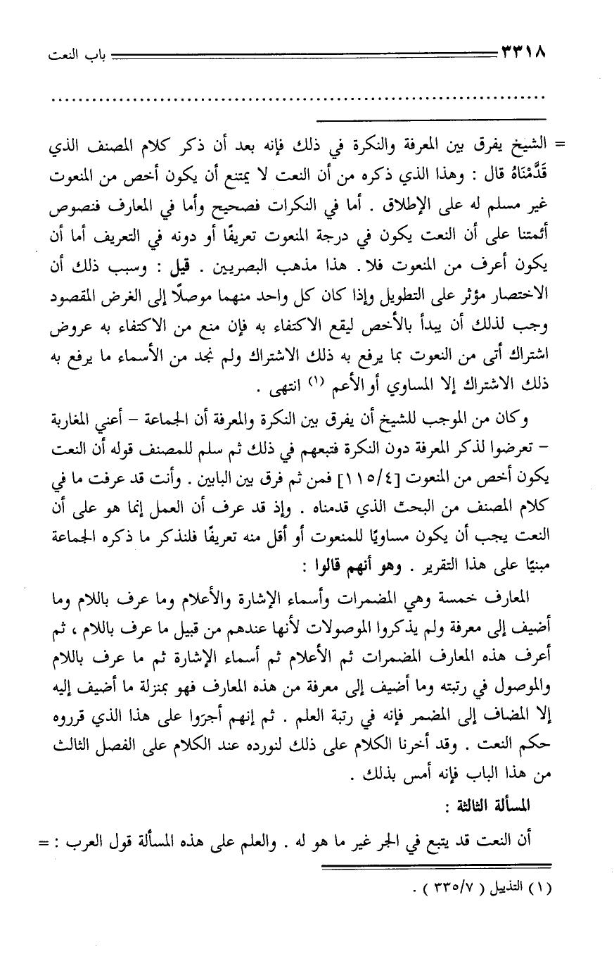 المعارف خمسة وهي المضمرات وأسماء الإشارة والأعلام وما عرف باللام وما أضيف إلى معرفة ولم يذكروا الموصولات لأنها عندهم من قبيل ما عرف باللام، ثم أعرف هذه المعارف المضمرات ثم الأعلام ثم أسماء الإشارة ثم ما عرف باللام والموصول في رتبته وما أضيف إلى معرفة من هذه المعارف فهو بمنزلة ما أضيف إليه إلا المضاف إلى المضمر فإنه في رتبة العلم. ثم إنهم أجروا على هذا الذي قرروه حكم النعت. وقد أخرنا الكلام على ذلك لنورده عند الكلام على الفصل الثالث من هذا الباب فإنه أمس بذلك.