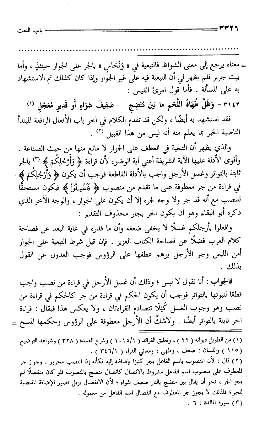 معناه يرجع إلى معنى الشواظ فالتبعية في «ونحاس» بالجر على الجوار حينئذ، وأما بيت جرير فلم يظهر لي أن التبعية فيه على غير الجوار وإذا كان كذلك تم الاستشهاد به على المسألة. فأما قول امرئ القيس:
