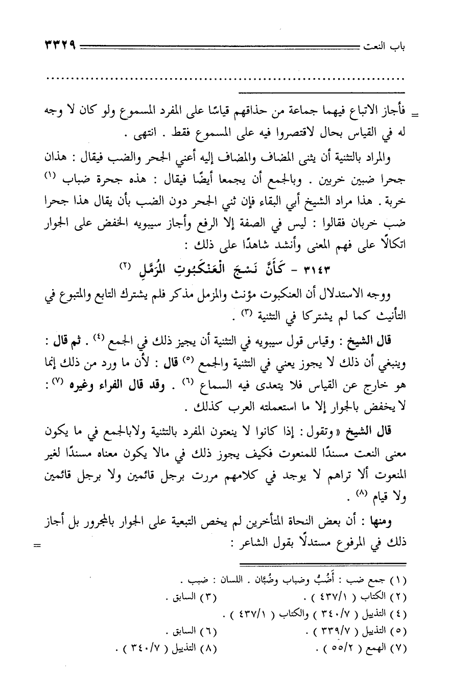 قال الشيخ «وتقول: إذا كانوا لا ينعتون المفرد بالتثنية ولا بالجمع في ما يكون معنى النعت مسندا للمنعوت فكيف يجوز ذلك في ما لا يكون معناه مسندا لغير المنعوت ألا تراهم لا يوجد في كلامهم مررت برجل قائمين ولا برجل قائمين ولا قيام (¬8).