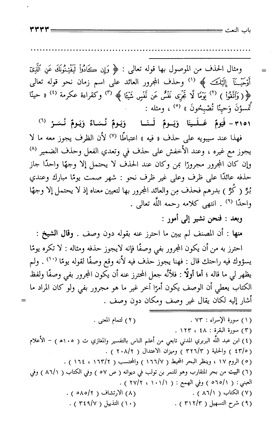 احترز به من أن يكون المجرور بفي وصفا فإنه لا يجوز حذفه ومثاله: لا تكره يوما يسؤوك فيه راحتك قال: فهنا يجوز حذف فيه لأنه وقع وصفا لقوله يوما (¬10). ولم يظهر لي ما قاله؛ أما أولا: فلأنّه جعل المحترز عنه أن يكون المجرور بفي وصفا ولفظ الكتاب يعطي أن الوصف يكون أمرا آخر غير ما هو مجرور بفي ولو كان المراد ما أشار إليه لكان يقال غير وصف ومكان دون وصف.
