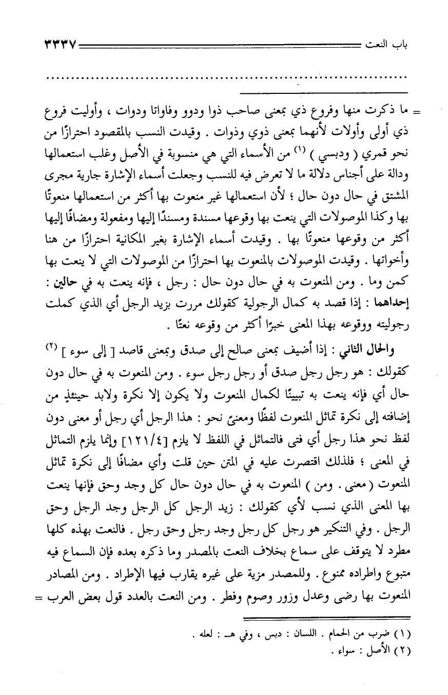 ما ذكرت منها وفروع ذي بمعنى صاحب ذوا ودوو وفاواتا ودوات، وأوليت فروع ذي أولى وأولات لأنهما بمعنى ذوي وذوات. وقيدت النسب بالمقصود احترازا من نحو قمري (ودبسي) (¬1) من الأسماء التي هي منسوبة في الأصل وغلب استعمالها ودالة على أجناس دلالة ما لا تعرض فيه للنسب وجعلت أسماء الإشارة جارية مجرى المشتق في حال دون حال؛ لأن استعمالها غير منعوت بها أكثر من استعمالها منعوتا بها وكذا الموصولات التي ينعت بها وقوعها مسندة ومسندا إليها ومفعولة ومضافا إليها أكثر من وقوعها منعوتا بها. وقيدت أسماء الإشارة بغير المكانية احترازا من هنا وأخواتها. وقيدت الموصولات بالمنعوت بها احترازا من الموصولات التي لا ينعت بها كمن وما. ومن المنعوت به في حال دون حال: رجل، فإنه ينعت به في حالين: