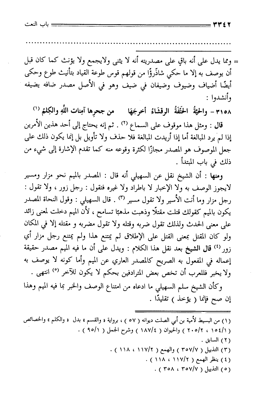 زور (¬4) قال الشيخ بعد نقل هذا الكلام: ويدل على أن ما فيه الميم مصدر حقيقة إعماله في المفعول به الصريح كالمصدر العاري عن الميم وأما كونه لا يوصف به ولا يخبر فللعرب أن تخص بعض المترادفين بحكم لا يكون للآخر (¬5) انتهى.