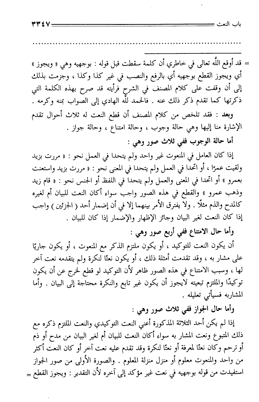 وبعد: فقد تلخص من كلام المصنف أن قطع النعت له ثلاث أحوال تقدم الإشارة منا إليها وهي حالة وجوب، وحالة امتناع، وحالة جواز.