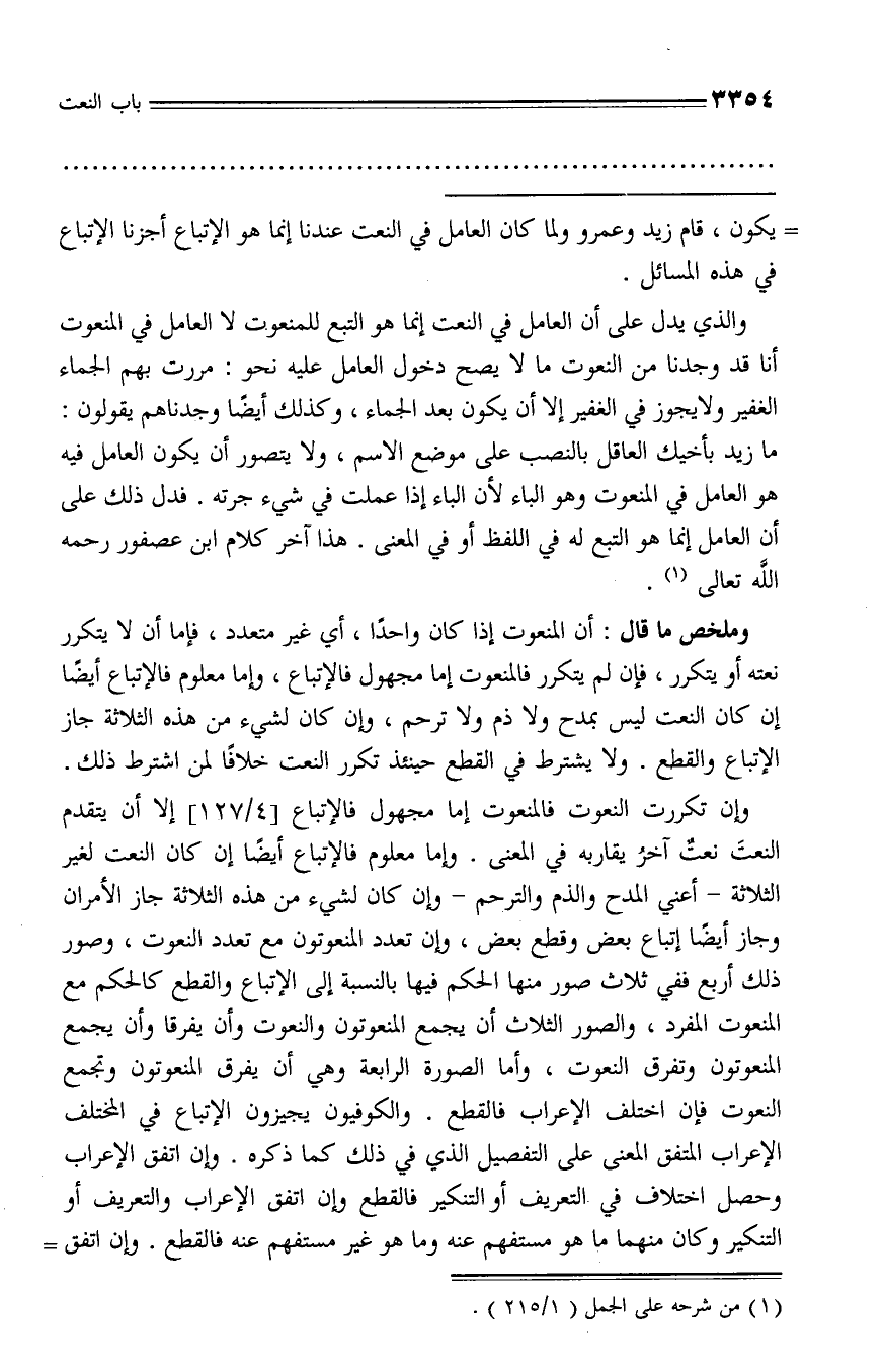 وملخص ما قال: أن المنعوت إذا كان واحدا، أي غير متعدد، فإما أن لا يتكرر نعته أو يتكرر، فإن لم يتكرر فالمنعوت إما مجهول فالإتباع، وإما معلوم فالإتباع أيضا إن كان النعت ليس بمدح ولا ذم ولا ترحم، وإن كان