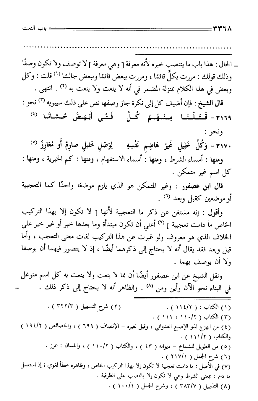 ونقل الشيخ عن ابن عصفور أيضا أن مما لا ينعت ولا ينعت به كل اسم متوغل في البناء نحو الآن وأين ومن (¬8). والظاهر أنه لا يحتاج إلى ذكر ذلك. -