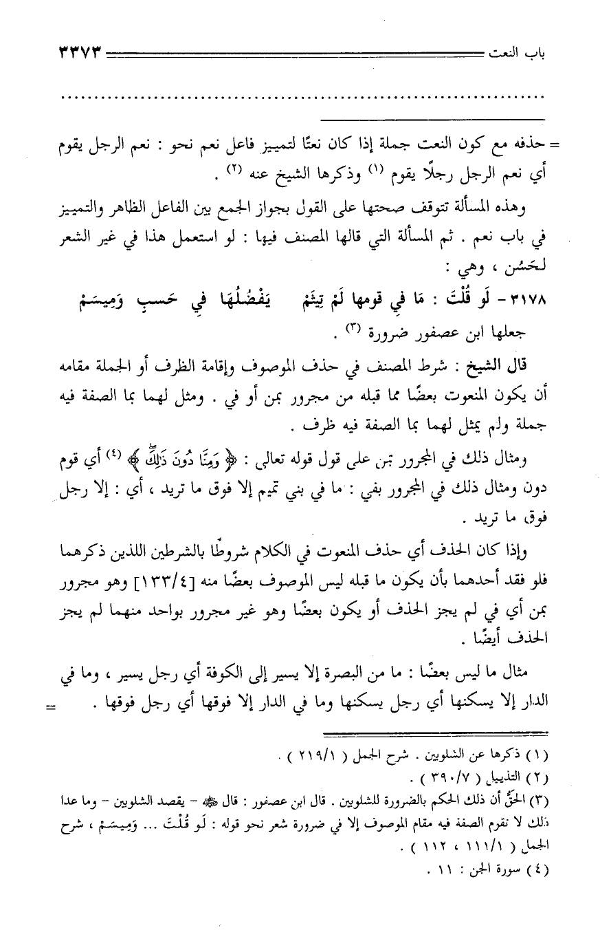 وإذا كان الحذف أي حذف المنعوت في الكلام شروطا بالشرطين اللذين ذكرهما فلو فقد أحدهما بأن يكون ما قبله ليس الموصوف بعضا منه [4/ 133] وهو مجرور بمن أي في لم يجز الحذف أو يكون بعضا وهو غير مجرور بواحد منهما لم يجز الحذف أيضا.