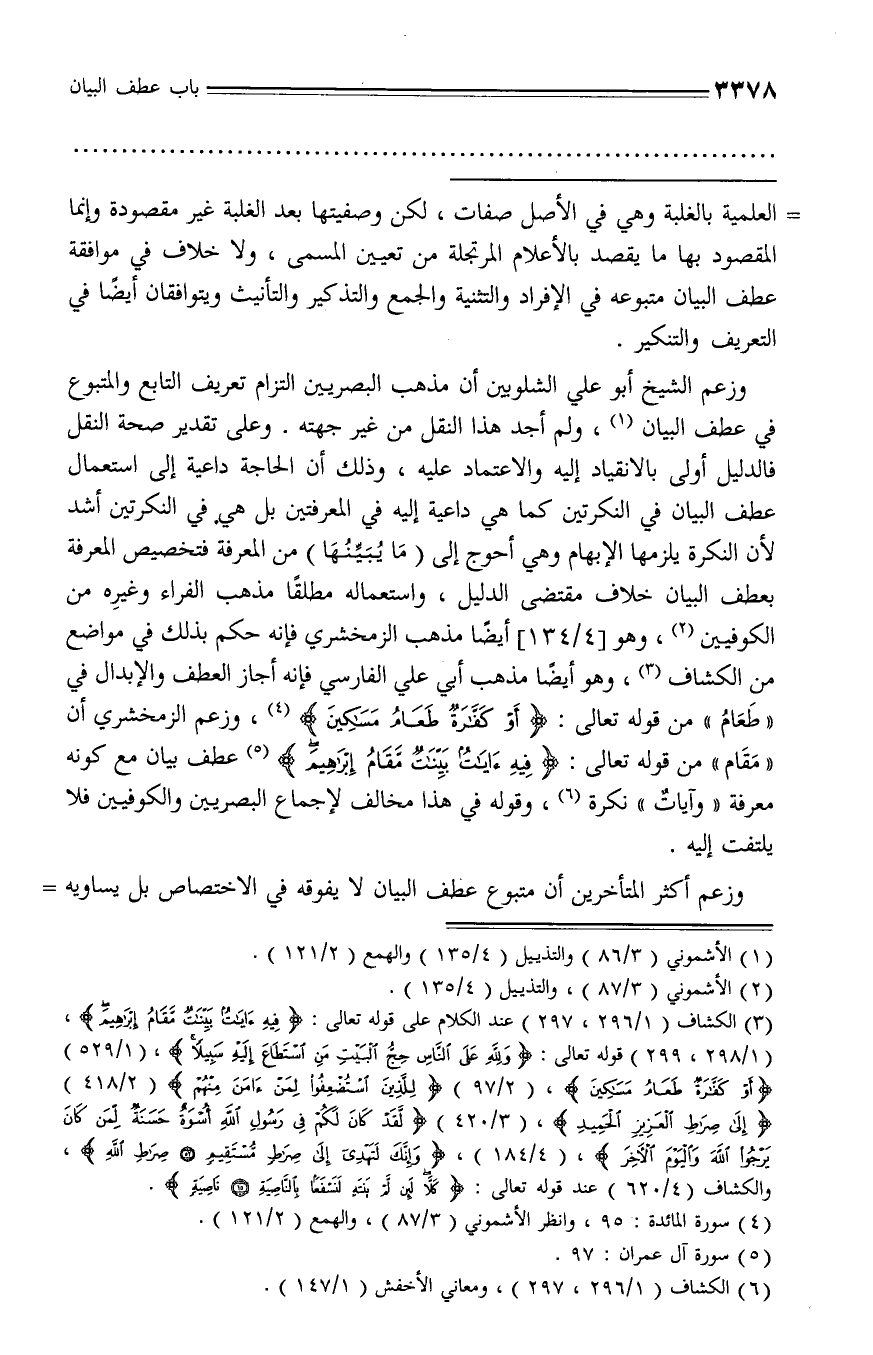 وزعم الشيخ أبو علي الشلوبين أن مذهب البصريين التزام تعريف التابع والمتبوع في عطف البيان (¬1)، ولم أجد هذا النقل من غير جهته. وعلى تقدير صحة النقل فالدليل أولى بالانقياد إليه والاعتماد عليه، وذلك أن الحاجة داعية إلى استعمال عطف البيان في النكرتين كما هي داعية إليه في المعرفتين بل هي في النكرتين أشد لأن النكرة يلزمها الإبهام وهي أحوج إلى (ما يبيّنها) من المعرفة فتخصيص المعرفة بعطف البيان خلاف مقتضى الدليل، واستعماله مطلقا مذهب الفراء وغيره من الكوفيين (¬2)، وهو [4/ 134] أيضا مذهب الزمخشري فإنه حكم بذلك في مواضع من الكشاف (¬3)، وهو أيضا مذهب أبي علي الفارسي فإنه أجاز العطف والإبدال في «طعام» من قوله تعالى: أَوْ كَفَّارَةٌ طَعامُ مَساكِينَ (¬4)، وزعم الزمخشري أن «مقام» من قوله تعالى: فِيهِ آياتٌ بَيِّناتٌ مَقامُ إِبْراهِيمَ (¬5) عطف بيان مع كونه معرفة «وآيات» نكرة (¬6)، وقوله في هذا مخالف لإجماع البصريين والكوفيين فلا يلتفت إليه.
