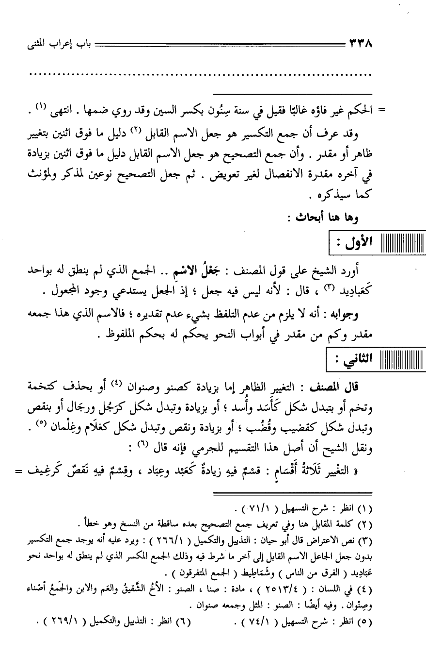 (¬3) نص الاعتراض قال أبو حيان: التذييل والتكميل (1/ 266): ويرد عليه أنه يوجد جمع التكسير بدون جعل الجاعل الاسم القابل إلى آخر ما شرط فيه وذلك الجمع المكسر الذي لم ينطق له بواحد نحو عباديد (الفرق من الناس) وشماطيط (الجمع المتفرقون).