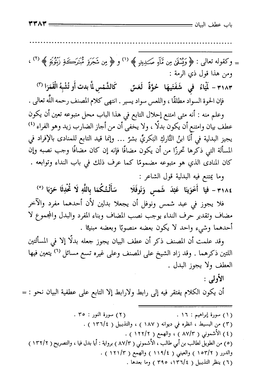 فلا يجوز في عبد شمس ونوفل أن يجعلا بدلين لأن أحدهما مفرد والآخر مضاف وتقدير حرف النداء يوجب نصب المضاف وبناء المفرد والبدل والمجموع لا أحدهما وشيء واحد لا يكون بعضه منصوبا وبعضه مبنيّا.