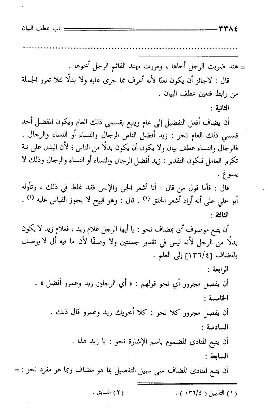أن يتبع موصوف أي بمضاف نحو: يا أيها الرجل غلام زيد، فغلام زيد لا يكون بدلا من الرجل لأنه ليس في تقدير جملتين ولا وصفا لأن ما فيه أل لا يوصف بالمضاف [4/ 136] إلى العلم.