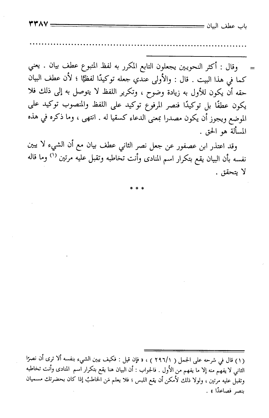 (¬1) قال في شرحه على الجمل (1/ 296)، «فإن قيل: فكيف يبين الشيء بنفسه ألا ترى أن نصرا الثاني لا يفهم منه إلا ما يفهم من الأول. فالجواب: أن البيان هنا يقع بتكرار اسم المنادى وأنت تخاطبه وتقبل عليه مرتين، ولولا ذلك لأمكن أن يقع اللبس؛ فلا يعلم من الخاطب إذا كان بحضرتك مسميان بنصر فصاعدا».
