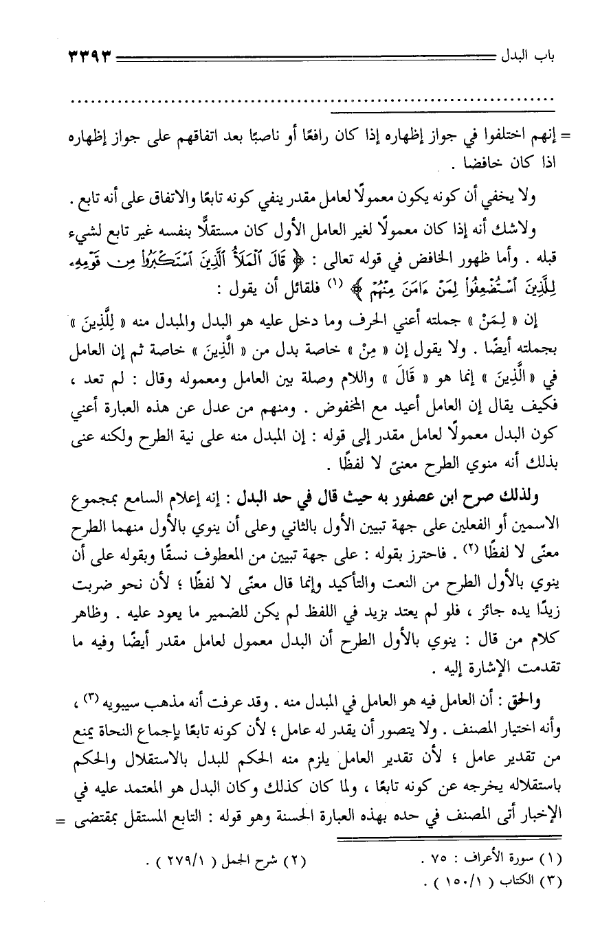 ولا شك أنه إذا كان معمولا لغير العامل الأول كان مستقلّا بنفسه غير تابع لشيء قبله. وأما ظهور الخافض في قوله تعالى: قالَ الْمَلَأُ الَّذِينَ اسْتَكْبَرُوا مِنْ قَوْمِهِ لِلَّذِينَ اسْتُضْعِفُوا لِمَنْ آمَنَ مِنْهُمْ (¬1) فلقائل أن يقول: