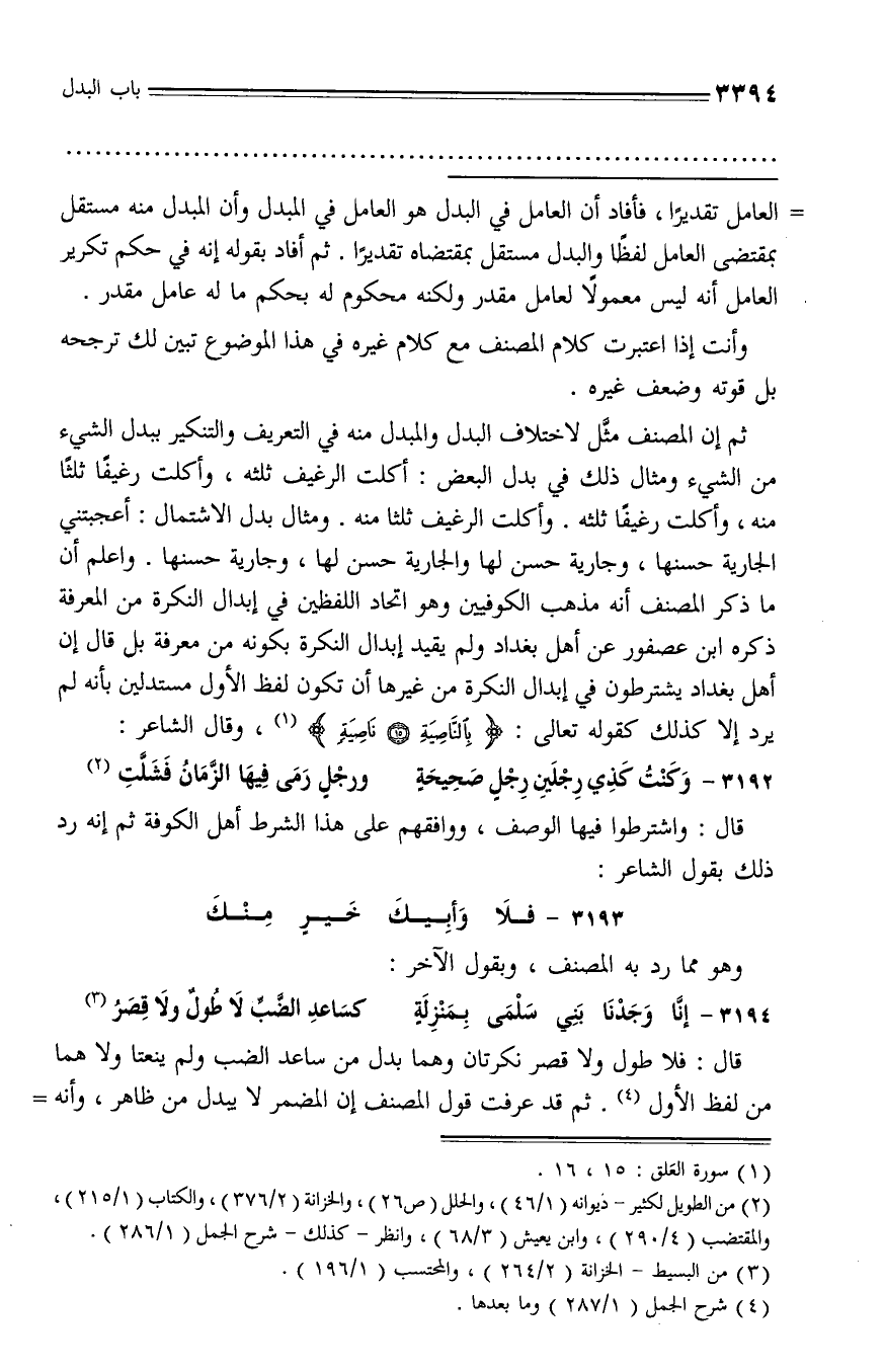 ثم إن المصنف مثّل لاختلاف البدل والمبدل منه في التعريف والتنكير ببدل الشيء من الشيء ومثال ذلك في بدل البعض: أكلت الرغيف ثلثه، وأكلت رغيفا ثلثا منه، وأكلت رغيفا ثلثه. وأكلت الرغيف ثلثا منه. ومثال بدل الاشتمال: أعجبتني الجارية حسنها، وجارية حسن لها والجارية حسن لها، وجارية حسنها. واعلم أن ما ذكر المصنف أنه مذهب الكوفيين وهو اتحاد اللفظين في إبدال النكرة من المعرفة ذكره ابن عصفور عن أهل بغداد ولم يقيد إبدال النكرة بكونه من معرفة بل قال إن أهل بغداد يشترطون في إبدال النكرة من غيرها أن تكون لفظ الأول مستدلين بأنه لم يرد إلا كذلك كقوله تعالى: بِالنَّاصِيَةِ 15 ناصِيَةٍ (¬1)، وقال الشاعر: