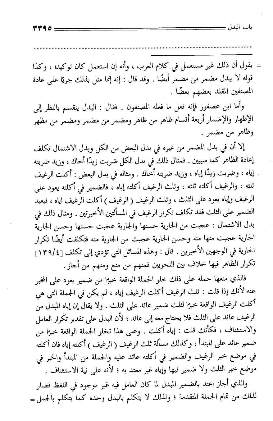 إلا أن في بدل المضمر من غيره في بدل البعض من الكل وبدل الاشتمال تكلف إعادة الظاهر كما سيبين. فمثال ذلك في بدل الكل ضربت زيدا أخاك، وزيد ضربته إياه، وضربت زيدا إياه، وزيد ضربته أخاك. ومثاله في بدل البعض: أكلت الرغيف ثلثه، والرغيف أكلته ثلثه، وثلث الرغيف أكلته إياه، فالضمير في أكلته يعود على الرغيف وإياه يعود على الثلث، وثلث الرغيف (الرغيف) أكلت الرغيف اياه، فيعيد الضمير على الثلث فقد تكلف تكرار الرغيف في المسألتين الأخيرتين. ومثال ذلك في بدل الاشتمال: عجبت من الجارية حسنها والجارية عجبت حسنها وحسن الجارية الجارية عجبت منها منه وحسن الجارية عجبت من الجارية منه فتكلفت أيضا تكرار الجارية في الوجهين الأخيرين. قال: وهذه المسائل التي تؤدي إلى تكلف [4/ 139] تكرار الظاهر فيها خلاف بين النحويين فمنهم من منع ومنهم من أجاز.