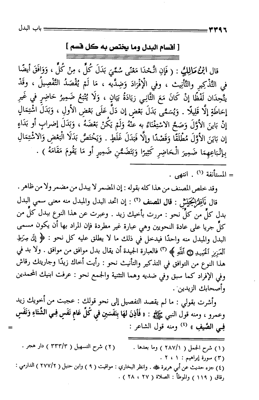 قال ناظر الجيش: قال المصنف (¬2): إن اتحد البدل والمبدل منه معنى سمي البدل بدل كلّ من كلّ نحو: مررت بأخيك زيد. وعبرت عن هذا النوع ببدل كلّ من كلّ جريا على عادة النحويين وهي عبارة غير مطردة فإن المراد بها أن يكون مسمى البدل والمبدل منه واحدا فيدخل في ذلك ما لا يطلق عليه كل نحو: إِلى صِراطِ الْعَزِيزِ الْحَمِيدِ 1 اللَّهِ (¬3) فالعبارة الجيدة أن يقال بدل موافق من موافق. ولا بد في هذا النوع من التوافق في التذكير والتأنيث نحو: رأيت أخاك زيدا وجاريتك رقاش وفي الإفراد كما سبق وفي ضديه وهما التثنية والجمع نحو: عرفت ابنيك المحمدين وأصحابك الزيدين.