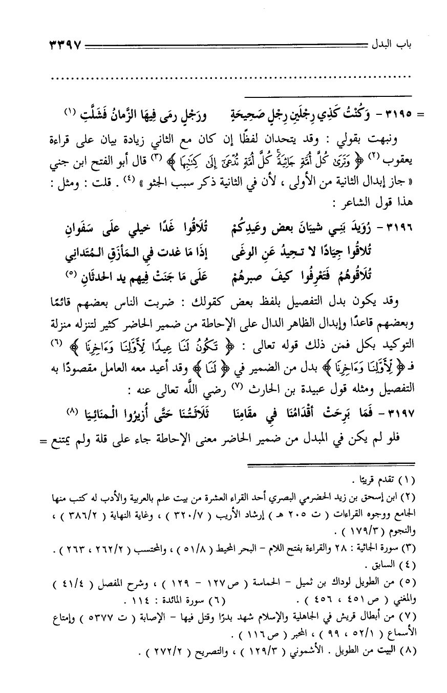 وقد يكون بدل التفصيل بلفظ بعض كقولك: ضربت الناس بعضهم قائما وبعضهم قاعدا وإبدال الظاهر الدال على الإحاطة من ضمير الحاضر كثير لتنزله منزلة التوكيد بكل فمن ذلك قوله تعالى: تَكُونُ لَنا عِيداً لِأَوَّلِنا وَآخِرِنا (¬6) فـ لِأَوَّلِنا وَآخِرِنا بدل من الضمير في (لنا) وقد أعيد معه العامل مقصودا به التفصيل ومثله قول عبيدة بن الحارث (¬7) رضي الله تعالى عنه: