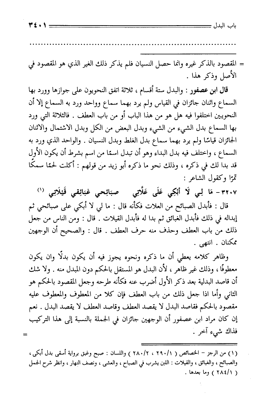 قال: فأبدل الصبائح من العلات فكأنه قال: ما لي لا أبكي على صبائحي ثم إبداله في ذلك فأبدل الغبائق ثم بدا له فأبدل القيلات. قال: ومن الناس من جعل ذلك من باب العطف وحذف منه حرف العطف. قال: والصحيح أن الوجهين ممكنان. انتهى.