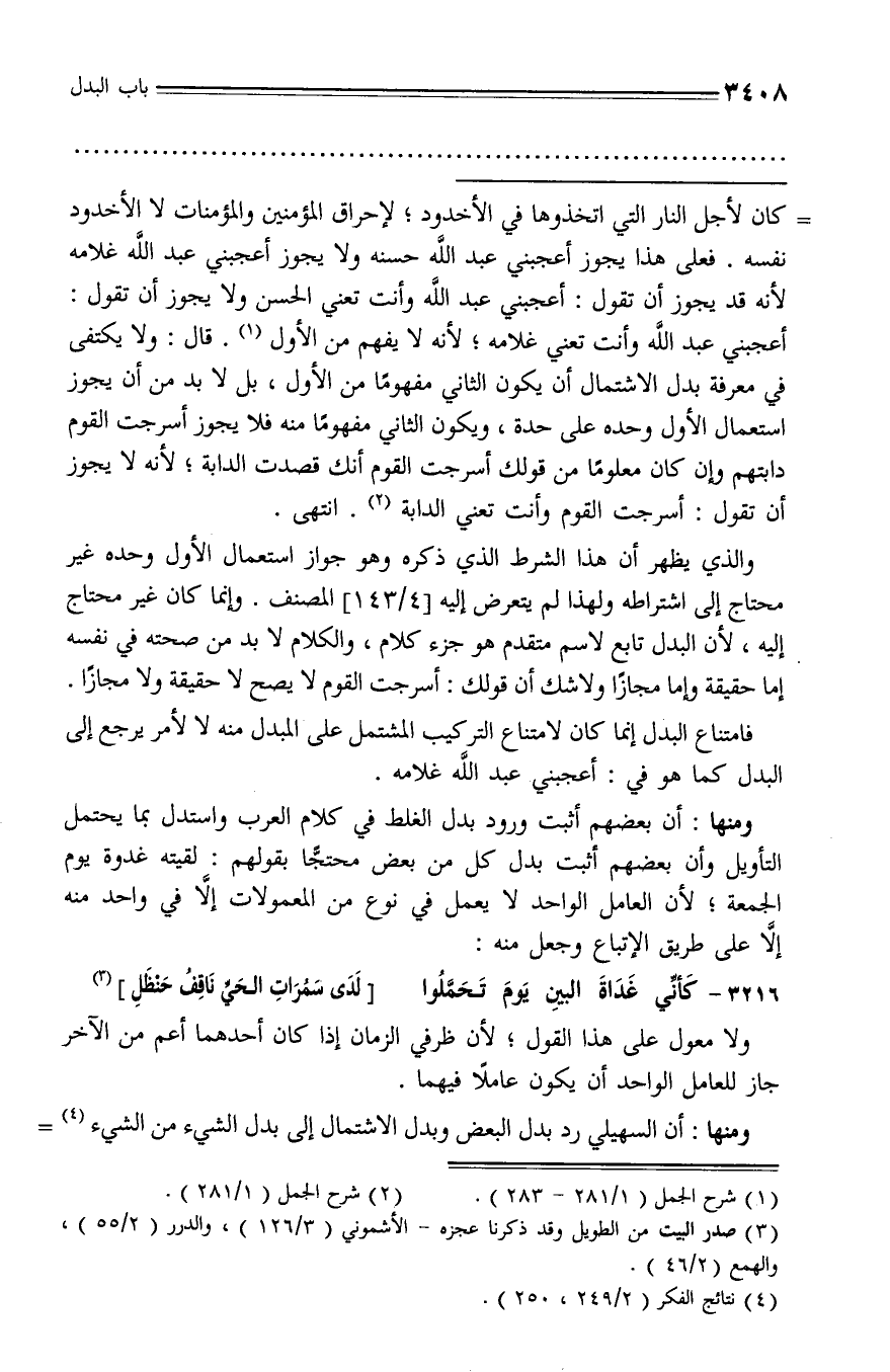 ومنها: أن بعضهم أثبت ورود بدل الغلط في كلام العرب واستدل بما يحتمل التأويل وأن بعضهم أثبت بدل كل من بعض محتجّا بقولهم: لقيته غدوة يوم الجمعة؛ لأن العامل الواحد لا يعمل في نوع من المعمولات إلّا في واحد منه إلّا على طريق الإتباع وجعل منه: