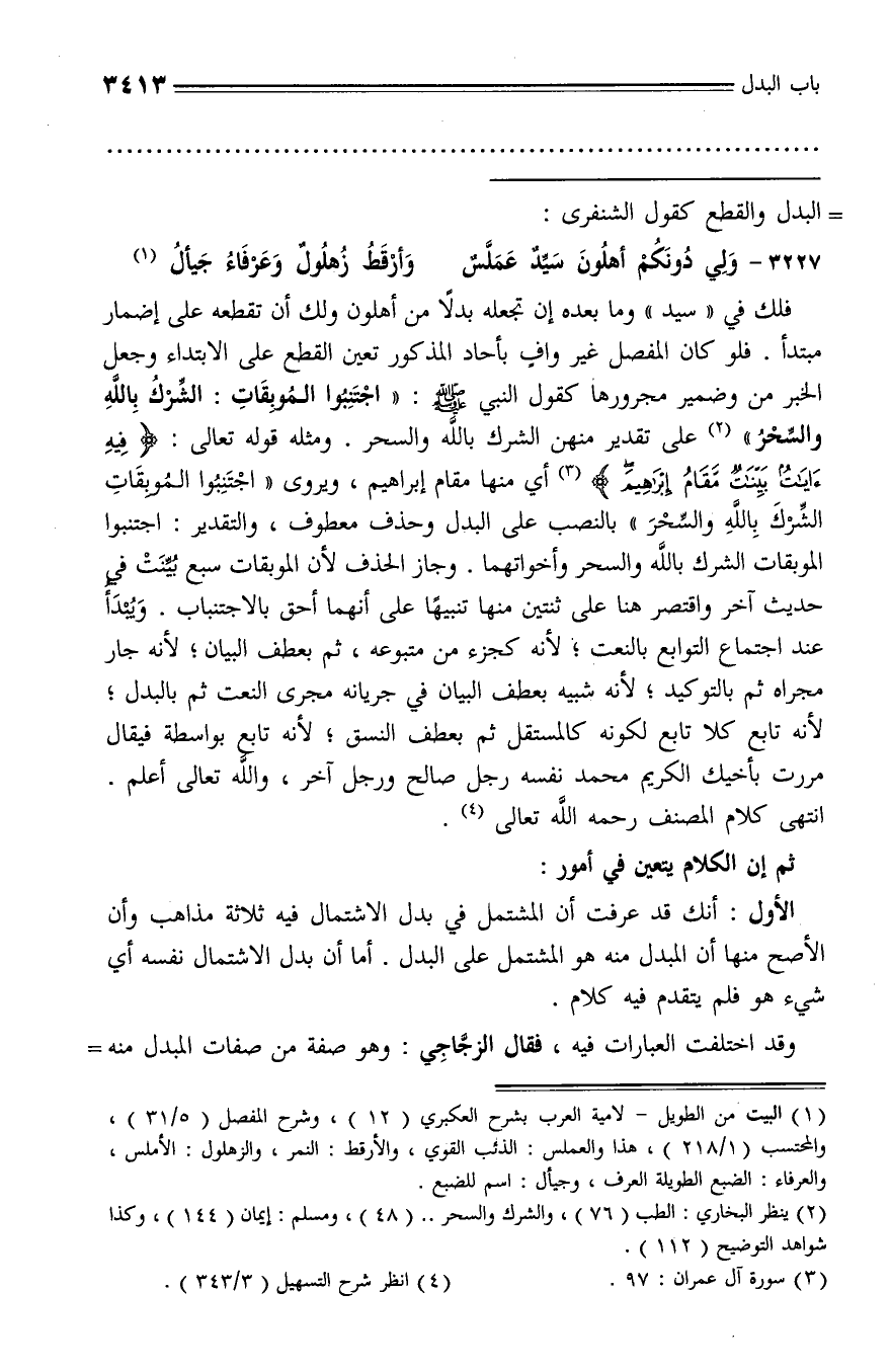 فلك في «سيد» وما بعده إن تجعله بدلا من أهلون ولك أن تقطعه على إضمار مبتدأ. فلو كان المفصل غير واف بأحاد المذكور تعين القطع على الابتداء وجعل الخبر من وضمير مجرورها كقول النبي صلّى الله عليه وسلّم: «اجتنبوا الموبقات: الشّرك بالله والسّحر» (¬2) على تقدير منهن الشرك بالله والسحر. ومثله قوله تعالى: فِيهِ آياتٌ بَيِّناتٌ مَقامُ إِبْراهِيمَ (¬3) أي منها مقام إبراهيم، ويروى «اجتنبوا الموبقات الشّرك بالله والسّحر» بالنصب على البدل وحذف معطوف، والتقدير: اجتنبوا الموبقات الشرك بالله والسحر وأخواتهما. وجاز الحذف لأن الموبقات سبع بيّنت في حديث آخر واقتصر هنا على ثنتين منها تنبيها على أنهما أحق بالاجتنباب. ويبدأ عند اجتماع التوابع بالنعت؛ لأنه كجزء من متبوعه، ثم بعطف البيان؛ لأنه جار مجراه ثم بالتوكيد؛ لأنه شبيه بعطف البيان في جريانه مجرى النعت ثم بالبدل؛ لأنه تابع كلا تابع لكونه كالمستقل ثم بعطف النسق؛ لأنه تابع بواسطة فيقال مررت بأخيك الكريم محمد نفسه رجل صالح ورجل آخر، والله تعالى أعلم.