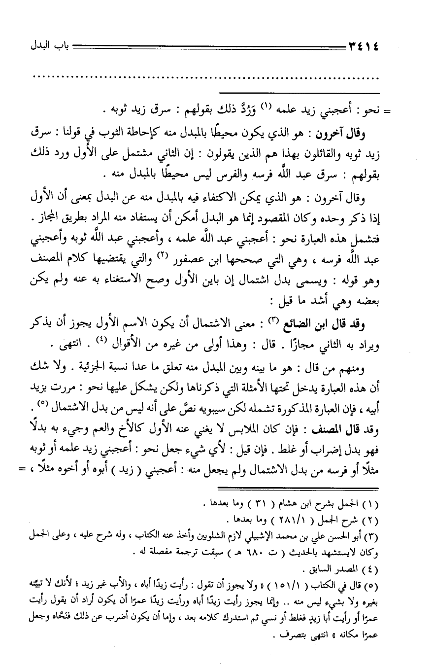 ومنهم من قال: هو ما بينه وبين المبدل منه تعلق ما عدا نسبة الجزئية. ولا شك أن هذه العبارة يدخل تحتها الأمثلة التي ذكرناها ولكن يشكل عليها نحو: مررت بزيد أبيه، فإن العبارة المذكورة تشمله لكن سيبويه نصّ على أنه ليس من بدل الاشتمال (¬5).